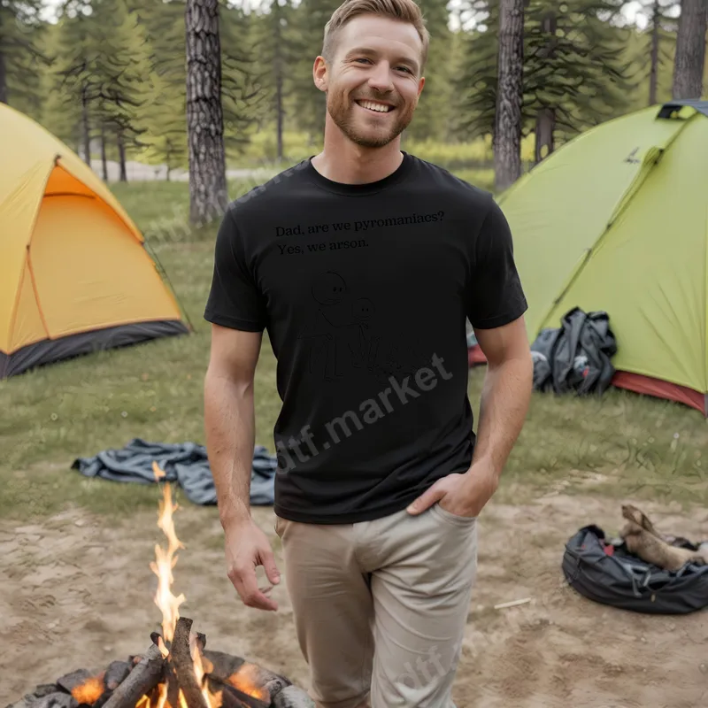 See allThis fun DTF transfer features a witty design of a dad and child stick figures sitting by a campfire, accompanied by the humorous text "Dad, are we pyromaniacs? Yes, we arson." It’s a clever play on words that will surely spark smiles and knowing glances. This ready to press design brings a unique, slightly mischievous charm to any garment, making it a standout piece for those who appreciate a good pun. Perfect for dads with a sense of humor, outdoor enthusiasts, or anyone who loves a good campfire and a clever joke. This design makes an excellent gift for Father's Day, birthdays, camping trips, or just because. It’s ideal for family gatherings, casual wear, or as a conversation starter at your next BBQ. Spread some laughter with this unforgettable heat press transfer. Applying this high-quality iron on transfer is incredibly simple. It adheres beautifully to cotton, polyester, and various blends. For best results, use a heat press at 300-325°F for 15 seconds with medium pressure, then peel cold. A household iron can also be used with firm, even pressure. Unlike traditional vinyl transfer, there's absolutely no weeding required, saving you time. Our direct to film transfers are crafted using premium DTF film and inks, ensuring vibrant colors and exceptional durability. The result is a soft-to-the-touch print that is crack-resistant and stretches with the fabric, maintaining its integrity wash after wash. Enjoy professional-grade shirt designs that look fantastic and last, bringing your creative visions to life.