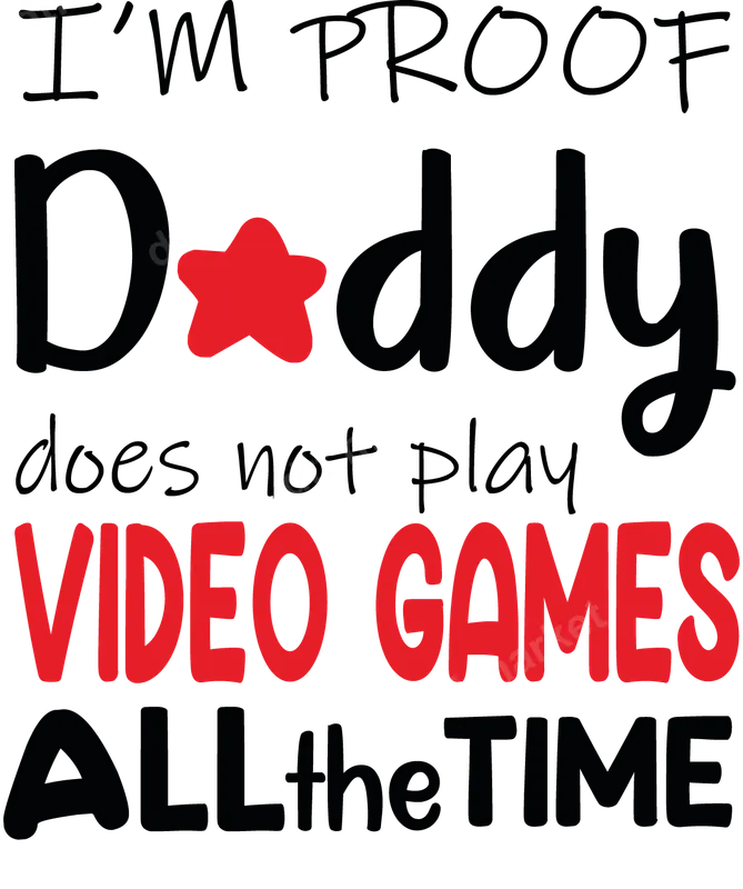 See allCelebrate the realities of dad life with this hilarious 'I'M PROOF Daddy does not play VIDEO GAMES ALL the TIME' DTF transfer. Featuring a playful mix of fonts in black and bold red, with a star substituting for the 'A' in Daddy, this ready to press design is sure to get smiles and nods of agreement. It’s the perfect apparel transfer for proud parents (or kids!) who want to playfully poke fun at a dad's gaming habits, proving he also makes time for his little ones. This unique design is ideal for gamer dads, new fathers, or anyone who appreciates a touch of parenting humor. It makes an excellent gift for Father's Day, birthdays, or as a fun surprise for family gatherings. Imagine this funny heat transfer on a baby's onesie, a toddler's shirt, or even a dad's own tee – a perfect way to show some love and lightheartedness. It's a fantastic conversation starter and a testament to dedicated dads. Applying this heat press transfer is incredibly simple. It adheres beautifully to a wide range of fabrics, including cotton, polyester, and their blends, making it versatile for almost any garment. Just apply with a heat press at 300-325°F for 15 seconds with medium pressure, then cold peel the film. No complicated weeding is required, saving you time and effort to create professional-looking custom apparel right at home or in your small business. Our DTF transfers are crafted for exceptional quality, offering vibrant colors that truly pop and a soft, flexible feel that won't crack or fade over time. Made with professional-grade DTF film and strong adhesive, each iron on transfer ensures a durable, long-lasting finish that can withstand numerous washes. Easily transform everyday items into personalized statements with this high-quality shirt design.
