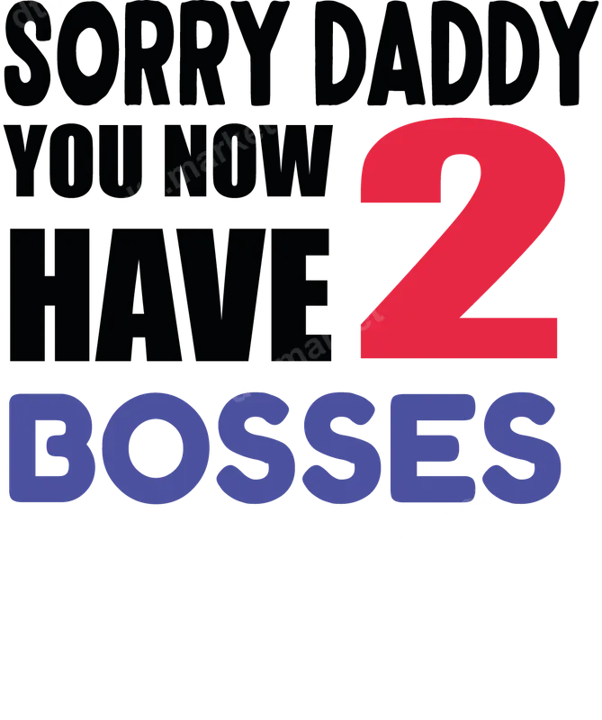 See allThis witty DTF transfer features the phrase 'SORRY DADDY YOU NOW HAVE 2 BOSSES' in a bold, eye-catching font, with '2' highlighted in red and 'BOSSES' in blue. It’s a humorous and relatable design perfect for any dad navigating the delightful chaos of having two little ones. This direct to film transfer is ready to press, making it easy to create custom apparel with a professional finish. This ready to press transfer is ideal for expectant parents announcing their second child or for a seasoned dad who’s just welcomed another "boss" into the family. It makes a fantastic Father's Day gift, a funny baby shower present for dads-to-be, or a playful surprise. Imagine him wearing this clever heat transfer on a family outing or as everyday wear, sparking smiles and conversations about the joys and demands of parenting two kids. Our high-quality heat press design works wonderfully on a wide range of materials, including cotton, polyester, and various fabric blends. For best results, apply this iron on transfer with a heat press at 300-325°F for 15 seconds with medium pressure. It can also be applied effectively with a household iron. Enjoy the convenience of a ready to press transfer that requires no weeding, cutting, or layering, saving you valuable time and effort. Each DTF transfer is crafted using professional-grade DTF film and inks, ensuring vibrant colors that pop and a durable finish resisting cracking and peeling. The result is a soft-to-touch apparel transfer that feels integrated into the fabric, not just sitting on top. Our direct to film transfers provide strong adhesive for long-lasting wear, making your custom shirt design a cherished item. Get ready to create personalized garments that stand out with superior quality.