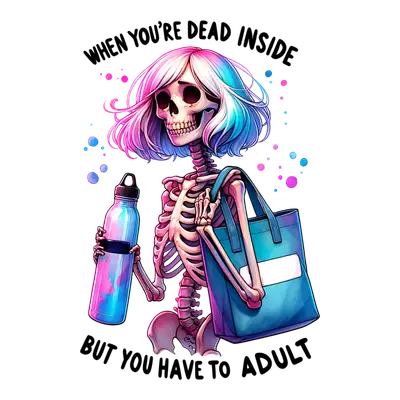 See allThis vibrant DTF transfer features a stylish skeleton with striking pink and blue hair, holding a tote bag and a water bottle, perfectly embodying the universally relatable sentiment: "When You're Dead Inside But You Have To Adult." The design combines a darkly humorous concept with a colorful, modern aesthetic, making it an instant conversation starter. It's a ready to press design that captures the everyday struggle of adulting with a touch of sarcastic charm. This design is an ideal iron on transfer for anyone who appreciates dark humor, millennial and Gen Z culture, or simply the daily grind of responsibilities. It's perfect for crafters looking for unique heat transfer designs, small t-shirt businesses wanting to add a popular, relatable meme to their inventory, or individuals seeking a fun way to express their current mood. A great gift for friends, coworkers, or yourself who navigate life with a knowing smirk and a strong coffee. Applying this heat press transfer is incredibly easy, working seamlessly on cotton, polyester, cotton-poly blends, and even nylon. Achieve professional results with a heat press (300-325°F for 15 seconds, medium pressure) or a standard household iron. Forget the hassle of weeding; simply peel and press! This versatile apparel transfer is perfect for creating custom t-shirts, hoodies, sweatshirts, tote bags, pillow covers, baby onesies, aprons, and denim jackets. For lasting durability, wash garments inside out and tumble dry low. Our ready to press transfers boast vibrant, full-color printing with exceptional fine detail. You'll love the crack-resistant finish and soft-to-the-touch feel, completely free from any heavy vinyl sensation. Each direct to film transfer is meticulously printed on premium DTF film, ensuring a strong adhesive backing for professional-quality results every single time.