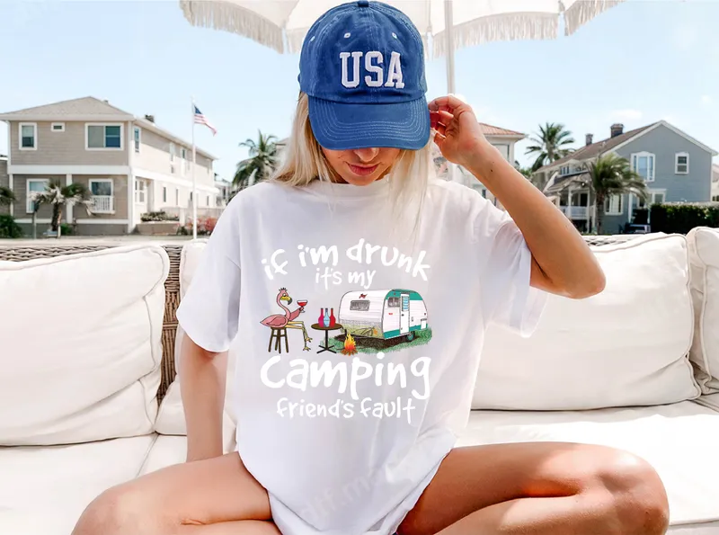 See allThis hilarious DTF transfer features a witty phrase: "if i'm drunk it's my Camping friend's fault." The design brings to life a fun outdoor scene with a relaxed flamingo sipping wine, a retro camper trailer, and a cozy campfire. This ready to press heat transfer perfectly captures the carefree spirit of camping trips and good times with friends, making it an instant conversation starter. Perfect for seasoned campers, RV enthusiasts, glamping fans, or anyone who enjoys a good laugh by the campfire. This funny shirt design is ideal for group camping trips, summer vacations, music festivals, or simply lounging around at home. It makes an excellent gift for your favorite camping buddy, a birthday surprise for an adventurous friend, or a fun addition to your own vacation wardrobe. Our premium DTF transfer is incredibly versatile, suitable for application on a wide range of fabrics including cotton, polyester, and blends. Achieve professional results using a heat press at 300-325°F for 15 seconds with medium pressure, or easily apply it with a household iron. This iron on transfer requires no weeding, making customization quick and effortless for any apparel transfer project. Experience superior quality with vibrant colors and sharp details that stand up to countless washes. Each heat press transfer is crafted from professional DTF film, ensuring excellent durability, crack resistance, and a soft, comfortable feel on your garment. You'll love the long-lasting finish and the ease of creating custom shirts and accessories with these top-tier designs.
