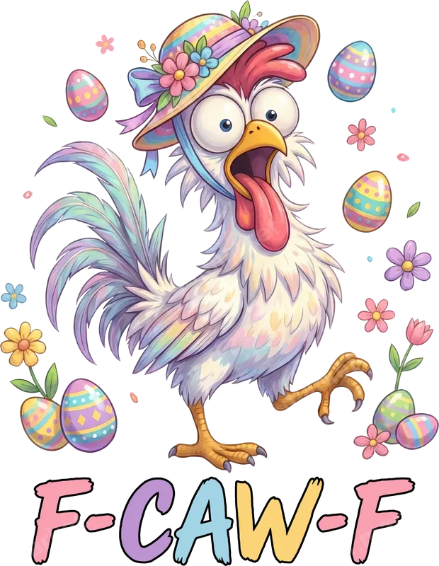 See allThis hilarious DTF transfer features a wide-eyed, pastel-colored rooster wearing a festive Easter bonnet, surrounded by whimsical flowers and patterned Easter eggs. The design captures a playful and slightly chaotic vibe, complete with the witty "F-CAW-F" text in a vibrant, brushstroke style. It's a high-quality, ready to press transfer that brings instant personality to any garment. Perfect for anyone who loves a good laugh and the playful spirit of Easter, this design appeals to those with a cheeky sense of humor. It makes a fantastic ready to press transfer for family gatherings, Easter egg hunts, spring festivals, or as a unique gift for friends and loved ones who appreciate quirky apparel. Imagine it on a t-shirt for a casual holiday party or a tote bag for a market visit. Our premium direct to film transfer is incredibly versatile, adhering beautifully to a wide range of materials including cotton, polyester, and popular blends. Applying this heat transfer is a breeze with either a professional heat press (recommended at 300-325°F for 15 seconds with medium pressure) or a household iron. Enjoy professional results with no tedious weeding required, making this iron on decal an effortless way to customize. Experience exceptional quality with this durable apparel transfer. The colors are incredibly vibrant, offering a soft-to-touch finish that resists cracking and peeling, ensuring your design looks fantastic wash after wash. Crafted from professional DTF film with a strong adhesive, this heat press design guarantees a lasting, high-definition print that truly stands out.