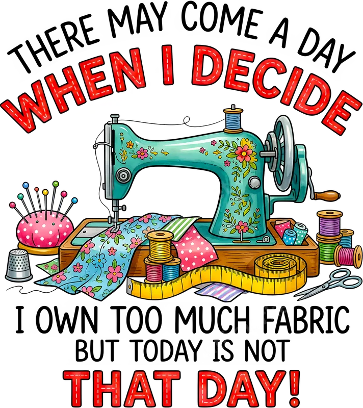 See allThis vibrant DTF transfer features a charming vintage-style sewing machine adorned with delicate flowers, surrounded by colorful spools of thread, fabric scraps, a thimble, pin cushion, and measuring tape. The witty quote, "THERE MAY COME A DAY WHEN I DECIDE I OWN TOO MUCH FABRIC BUT TODAY IS NOT THAT DAY!", perfectly captures the humorous reality of every passionate crafter and fabric collector. This ready to press design is sure to bring a smile to anyone who understands the joy of a growing stash. This unique heat press transfer is ideal for sewers, quilters, crafters, and anyone who enjoys DIY projects. It makes a fantastic gift for birthdays, Mother's Day, Christmas, or just because, celebrating their love for fabric and handmade creations. Imagine it on a personalized t-shirt for a craft retreat, a custom tote bag for fabric shopping, or an apron for endless hours at the sewing machine. It's a fun way to express a shared passion and bring a touch of humor to their wardrobe. Our premium DTF transfers are designed for easy application on a wide range of materials, including cotton, polyester, and most fabric blends. Simply use a heat press at 300-325°F for 15 seconds with medium pressure, or apply with a household iron following similar guidelines. This "iron on transfer" requires no weeding, saving you time and effort, making custom apparel a breeze for both beginners and experienced crafters. Experience professional-grade quality with every "t-shirt transfer". Our direct to film transfers boast incredibly vibrant colors, exceptional durability, and a soft-to-touch finish that won't crack or fade. Made with high-quality DTF film and strong adhesive, your new apparel transfer will withstand countless washes, ensuring your humorous design stays looking fresh and fantastic for years to come.