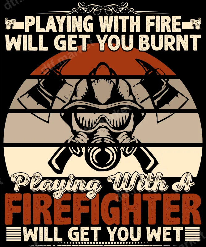See allIgnite some humor with this bold "Playing With Fire Will Get You Burnt, Playing With A Firefighter Will Get You Wet" DTF transfer. This design features a detailed firefighter helmet with a mask and crossed axes, set against a stylish striped background in earthy tones. It's a perfect ready to press design for anyone in the fire service or those who appreciate their bravery and a good laugh.