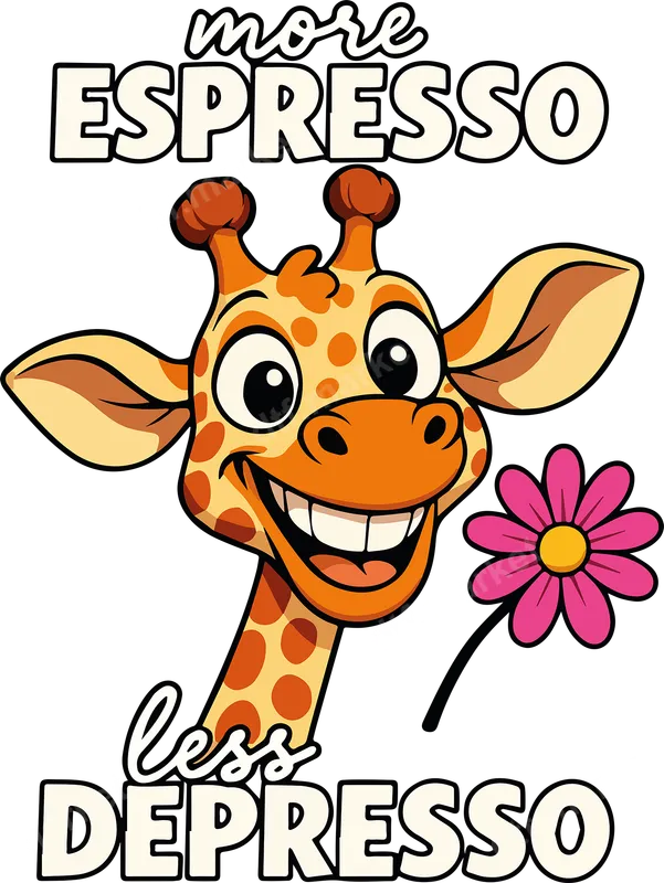 See allThis delightful DTF transfer features an irresistibly cheerful cartoon giraffe, wide-eyed and smiling, holding a vibrant pink flower. Below the charming animal, the playful phrase "more ESPRESSO less DEPRESSO" is prominently displayed in a bold, creamy font, complemented by a whimsical script for "more" and "less." This heat press ready design is perfect for anyone who loves a good laugh and their daily dose of caffeine, offering a lighthearted take on staying positive. Ideal for coffee aficionados, baristas, students, or anyone who needs a fun pick-me-up, this ready to press transfer makes an excellent gift for birthdays, holidays, or just because. Imagine this cheerful design adorning a cozy hoodie for your morning coffee run, a playful t-shirt for casual outings, or even a personalized tote bag. It's a fantastic way to spread smiles and share your love for coffee and good vibes. Applying this vibrant iron on transfer is a breeze on cotton, polyester, and various fabric blends. For best results, use a heat press at 300-325°F for 15 seconds with medium pressure, then cold peel the film. A household iron can also be used. Our professional direct to film transfers require absolutely no weeding, saving you time and effort. Experience professional-grade quality with every heat press design. Our apparel transfers boast incredibly vibrant colors that pop, superior stretchability, and excellent crack resistance, ensuring your design looks fantastic wash after wash. The soft-touch finish feels comfortable on any garment. Crafted using durable DTF film and strong adhesive, this t-shirt transfer guarantees a long-lasting, high-quality finish.