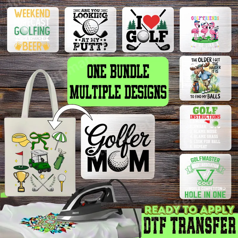 See allUnleash your inner golf enthusiast with this fantastic bundle of golf DTF transfers! Featuring a variety of witty, heartwarming, and humorous designs, this collection is perfect for anyone who loves the links. Each direct to film transfer is ready to press, making it easy to create custom apparel and accessories that celebrate your passion for golf, from witty sayings like "ARE YOU LOOKING AT MY PUTT?" to charming graphics for "Golfer Mom." This versatile set of designs is ideal for all golf lovers, golf moms, and groups of golf friends. Whether you're heading to a casual round, a tournament, or simply showing off your love for the game, these transfers add a unique touch. They make fantastic gifts for birthdays, Mother's Day, Father's Day, or as fun additions to golf event goodie bags. The bundle includes designs ranging from playful flamingos to a hilarious moose, ensuring there's something for every personality. Applying these ready to press transfers is incredibly simple, whether you're using a professional heat press or a household iron. They work beautifully on a wide range of fabrics including cotton, polyester, and cotton/poly blends. Just press at 300-325°F for 15 seconds with medium pressure, peel cold, and press again for 5 seconds for optimal adhesion. There's no tedious weeding required, making your DIY projects quick and enjoyable. Experience the premium quality of our DTF transfers. Each heat press transfer boasts vibrant colors, excellent wash durability, and a soft, flexible feel that won't crack or peel. Manufactured using professional-grade DTF film and strong adhesive, these shirt designs ensure your custom creations look fantastic and last for countless rounds. Get ready to transform your garments with ease and style!