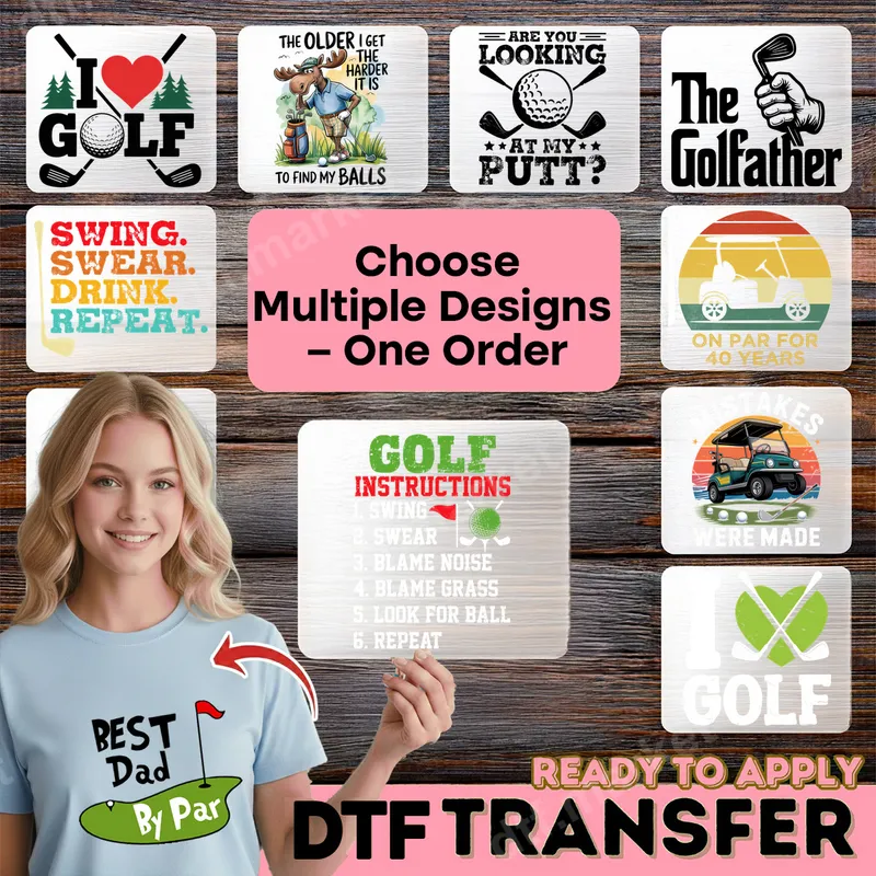 See allDiscover our collection of hilarious golf DTF transfers, perfect for adding a touch of humor to any golfer's wardrobe. Featuring witty sayings like "The Golfather," "Swing. Swear. Drink. Repeat.," and the classic "I ❤️ Golf" alongside playful graphics of golf carts, clubs, and balls, these designs are ready to press onto your favorite garments. Each direct to film transfer is designed for easy application, ensuring a professional look without the hassle. These humorous designs are ideal for the golf enthusiast, whether they're a seasoned pro or just love hitting the links. They make fantastic gifts for dads, grandfathers, golf buddies, or anyone who appreciates a good golf-themed joke. Perfect for Father's Day, birthdays, golf league events, or simply to add some personality to your everyday golf apparel. These ready to press transfers are sure to get a laugh on and off the course. Applying your new heat transfer is a breeze. Our DTF transfers work seamlessly on a variety of materials, including cotton, polyester, and blends. Simply use a heat press at 300-325°F for 15 seconds with medium pressure, or apply with a household iron (firm pressure, no steam). There's no weeding required, making it a quick and easy process to transform any blank into a custom shirt design or unique apparel. Experience superior quality with vibrant colors, excellent wash durability, and a soft-to-the-touch finish. Our professional DTF film ensures a crack-resistant and long-lasting apparel transfer with strong adhesive that withstands countless washes. Create personalized t-shirts, hoodies, golf bags, and more with these premium iron on transfers that look and feel great.