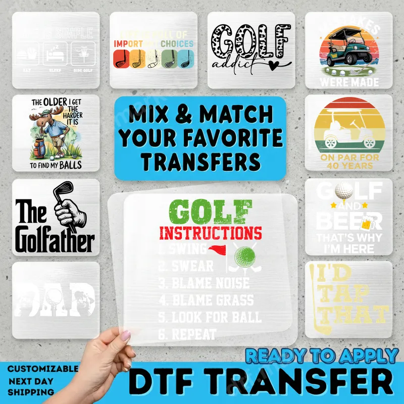 See allThis humorous 'Golf Instructions' DTF transfer captures the playful frustration of a day on the green. Featuring bold green and red text with a golf flag and ball graphic, this ready to press design lists the unofficial, yet relatable, steps of a golf game: '1. Swing, 2. Swear, 3. Blame Noise, 4. Blame Grass, 5. Look for Ball, 6. Repeat.' It’s the perfect apparel transfer for those who enjoy the sport with a sense of humor. Ideal for golf dads, weekend warriors, and anyone who enjoys a round with a side of humor, this heat transfer makes a fantastic gift. Surprise the golfer in your life for Father's Day, birthdays, or as a fun addition to their golf league attire. It's also great for casual wear, golf outings, or just showing off your love for the game with a witty twist. This unique heat press design is sure to spark conversations on and off the course. Applying this direct to film transfer is straightforward and hassle-free. Our high-quality iron on decal works seamlessly on a wide range of fabric types, including cotton, polyester, and various blends. For best results, use a heat press at 300-325°F for 15 seconds with medium pressure. It's also possible to apply with a household iron, making it accessible for everyone. Best of all, there's no weeding required, saving you time and effort. Experience vibrant colors and exceptional durability with our professional-grade DTF transfers. Each ready to press transfer is printed on premium DTF film, ensuring your design remains crack and peel-resistant, and soft to the touch even after multiple washes. The strong adhesive guarantees a long-lasting bond to your chosen garment, providing a professional finish that stands out. Elevate your wardrobe with a durable and eye-catching shirt design.