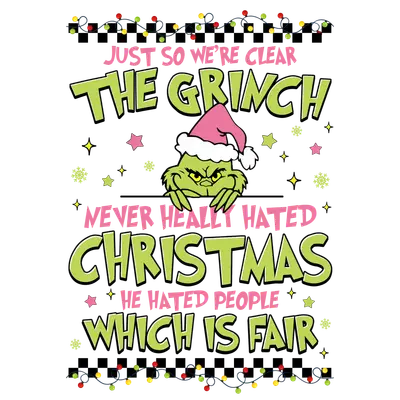 See allDive into holiday humor with this vibrant 'Just So We're Clear The Grinch Never Really Hated Christmas, He Hated People Which Is Fair' DTF transfer. Featuring a classic green character peeking from above the text, wearing a festive pink Santa hat, this ready to press design perfectly captures a humorous take on holiday sentiments. Adorned with colorful Christmas lights and sparkling stars, it’s ideal for anyone who appreciates a touch of sarcasm during the festive season. This unique heat transfer design is perfect for those with a witty sense of humor, making it an excellent iron on transfer for sarcastic friends, introverted family members, or anyone who finds holiday crowds a bit much. Great for ugly sweater parties, family gatherings, or as a funny gift for coworkers. Small businesses and crafters can easily create popular holiday apparel, adding a distinctive touch to their Christmas inventory and bringing a smile to their customers. Applying this heat press transfer is simple and efficient. It works beautifully on a wide range of materials, including cotton, polyester, cotton-poly blends, and even nylon. For best results, use a heat press at 300-325°F for 15 seconds with medium pressure, or apply with a household iron. No tedious weeding is required – just peel and press! Create custom t-shirts, cozy hoodies, festive sweatshirts, fun tote bags, or even unique pillow covers. For lasting durability, wash garments inside out and tumble dry low. Our ready to press transfer ensures vibrant, full-color printing with exceptional detail, bringing the Grinch's cheeky expression to life. Enjoy a crack-resistant finish that feels soft to the touch, without the heavy, stiff feel of traditional vinyl. Each direct to film transfer is produced on premium DTF film with a robust adhesive backing, guaranteeing professional-grade results every time you press. Elevate your apparel with a transfer designed for both quality and durability.