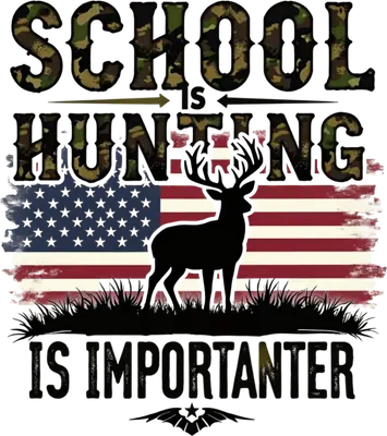 Show off your passion for the outdoors with this humorous 'School is Hunting Is Importanter' DTF transfer. Featuring bold, camouflage-patterned text for 'SCHOOL' and 'HUNTING', an iconic deer silhouette, and a distressed American flag background, this design captures a playful, patriotic spirit. This high-quality, ready to press transfer is perfect for anyone who prioritizes the thrill of the hunt.