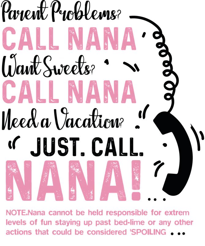 See allThis hilarious DTF transfer features the playful phrase "Parent Problems? CALL NANA Want Sweets? CALL NANA Need a Vacation? JUST. CALL. NANA!" It captures the loving, mischievous spirit of grandmas who adore spoiling their grandchildren. The design, with its mix of distressed pink block lettering and elegant script, is perfectly accented by a retro telephone graphic, making it a charming and ready to press design for any item. This design is a fantastic choice for proud grandmas, Nanas, or any grandparent figure who embraces the joy of spoiling their beloved grandkids. It's ideal for Mother's Day, birthdays, Christmas, or as a thoughtful "just because" gift for the Nana in your life. Create custom apparel for family reunions, grandparent appreciation events, or simply to show off that special bond. It's also a great iron on transfer for crafting personalized gifts. Our high-quality DTF transfer works seamlessly on a wide range of fabrics including cotton, polyester, and their blends. Application is straightforward: simply use a heat press at 300-325°F for 15 seconds with medium pressure, or apply with a household iron. Unlike vinyl, there's absolutely no weeding required, making your crafting process quick and enjoyable. This heat press design ensures professional results every time. Experience superior quality with our direct to film transfer. Each design boasts vibrant colors, excellent wash durability, and is crack-resistant, ensuring your customized items look great for years to come. Printed on professional-grade DTF film with a strong adhesive, this apparel transfer offers a soft hand feel and stretches with the fabric. Enjoy a durable, high-quality shirt design that stands out.