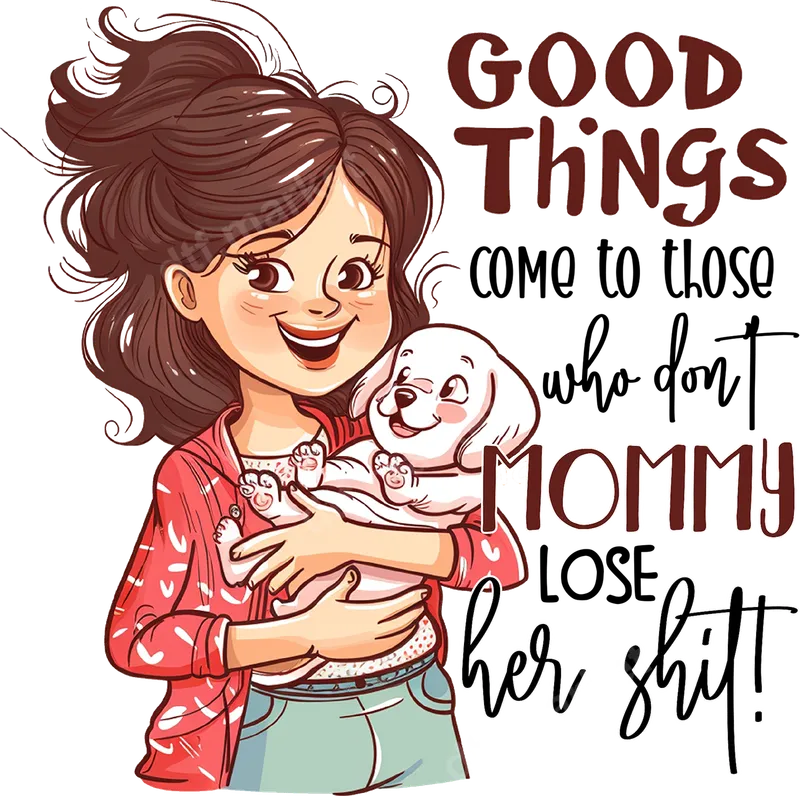 See allThis hilarious DTF transfer features a smiling, slightly disheveled cartoon mom happily cradling an adorable white puppy, embodying the relatable chaos of motherhood. The bold and expressive text reads: "GOOD Things COME to those who don't MOMMY LOSE her shit!". This vibrant, ready to press design perfectly captures the triumphant feeling of navigating the daily challenges of parenting with a sense of humor. This design is ideal for any mom who embraces the beautiful mess of mom life and isn't afraid to share a laugh about it. It makes an unforgettable gift for Mother's Day, birthdays, baby showers for moms-to-be with a strong personality, or just as a fun surprise for your favorite mom friend. Perfect for everyday wear, this heat transfer is sure to spark smiles and knowing nods from fellow parents. Applying this direct to film transfer is incredibly easy, making it perfect for both crafting beginners and seasoned pros. Our high-quality iron on transfer works seamlessly on a wide range of fabrics, including 100% cotton, polyester, and cotton-poly blends. Simply apply with a heat press at 300-325°F for 15 seconds with medium pressure, then peel cold. For those without a heat press, a household iron can also be used following specific instructions. Best of all, there’s absolutely no weeding or layering required! Experience professional-grade results with our premium apparel transfer. Each DTF transfer is meticulously printed to ensure exceptionally vibrant colors and crisp details that truly pop. Our durable design is crack-resistant, incredibly soft to the touch, and designed to withstand countless washes without fading. Made with professional-grade DTF film and strong adhesive, this heat press design offers a long-lasting, high-quality finish for all your custom creations.