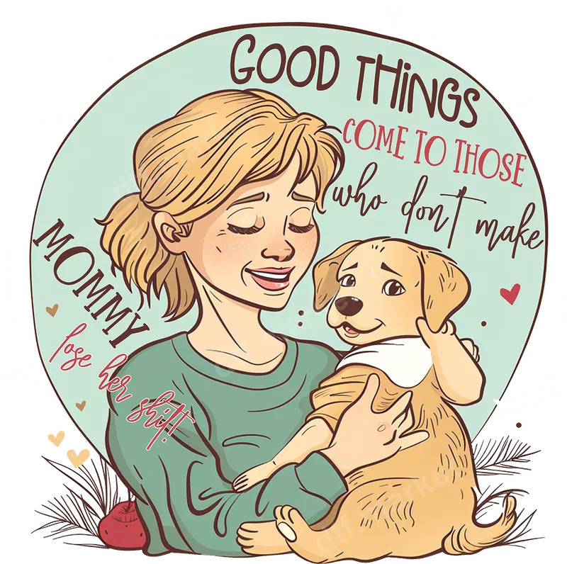 See allThis charming yet hilariously relatable DTF transfer features a smiling blonde mom affectionately holding a cute golden retriever puppy, all enclosed within a soft teal circle. The design is framed by the witty quote, "GOOD THINGS COME TO THOSE who don't make MOMMY lose her shit!" It's a perfect ready to press DTF transfer for any parent who understands the delightful chaos of everyday life with kids and pets. This design is ideal for moms, dog lovers, and anyone with a sarcastic sense of humor. It makes an excellent heat press transfer for Mother's Day gifts, birthday presents, or simply to add a touch of personality to your everyday wardrobe. Imagine this iron on decal on a comfy sweatshirt for a relaxed weekend, sparking smiles and nods of agreement from fellow parents. Applying this DTF transfer is straightforward. It works beautifully on a wide range of fabric types, including cotton, polyester, and various blends. For best results, use a heat press at 300-325°F for 15 seconds with medium pressure, then peel cold. If you're using a household iron, ensure even, firm pressure. There's no complex weeding required, making custom apparel creation quick and easy. Our professional-grade DTF transfers deliver vibrant colors and exceptional durability. The print is crack-resistant, highly flexible, and has a soft feel to the touch, ensuring your t-shirt transfer looks great and lasts wash after wash. Transform ordinary garments into personalized statements with this high-quality, long-lasting apparel transfer.