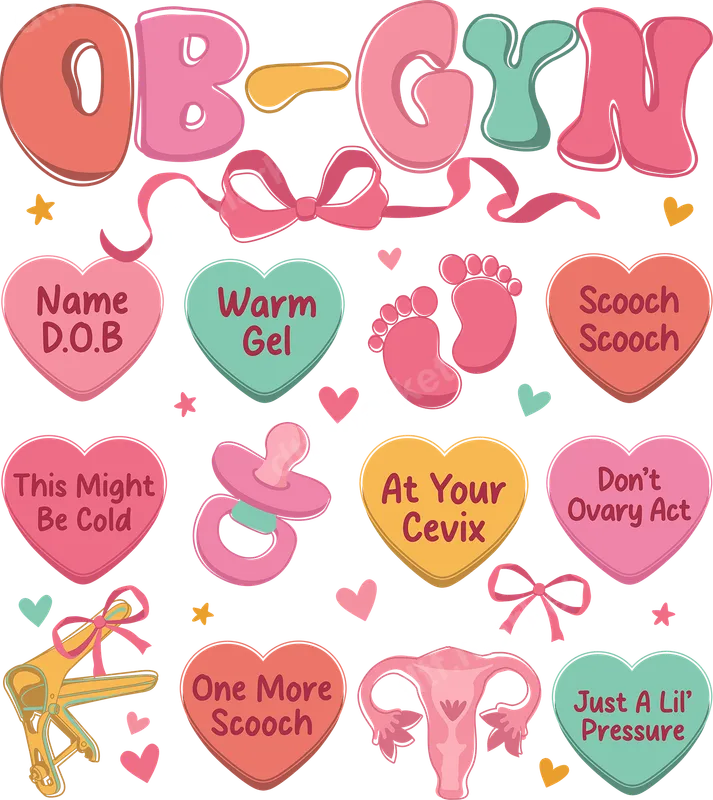 See allShow your sense of humor with our unique OB-GYN medical humor DTF transfer. This playful design features a bold 'OB-GYN' title alongside conversation heart-style candies with witty phrases like 'Warm Gel,' 'Scooch Scooch,' and 'Don't Ovary Act.' Adorned with baby footprints, a pacifier, and a stylized speculum, this ready to press transfer is perfect for adding a lighthearted touch to any garment. This hilarious heat transfer is ideal for obstetricians, gynecologists, nurses, medical assistants, or anyone working in women's health. It makes an excellent gift for a healthcare professional's birthday, graduation, or as a fun way to lighten the mood at the clinic. It's also great for medical students or anyone who appreciates a good dose of medical comedy, making it a memorable apparel transfer. Applying this ready to press transfer is simple and efficient. Our high-quality DTF transfers are compatible with a wide range of fabrics, including cotton, polyester, and various blends. Achieve professional results with a heat press at 300-325°F for 15 seconds with medium pressure, or use a household iron for smaller projects. There's no need for tedious weeding, saving you time and effort. Experience superior quality with our professional-grade direct to film transfers. Each design boasts vibrant, true-to-color prints that resist cracking and peeling, ensuring lasting wear. The soft-touch finish integrates seamlessly with your fabric, providing comfort without stiffness. Our premium DTF film and strong adhesive ensure your shirt design endures countless washes, maintaining its integrity and humor.