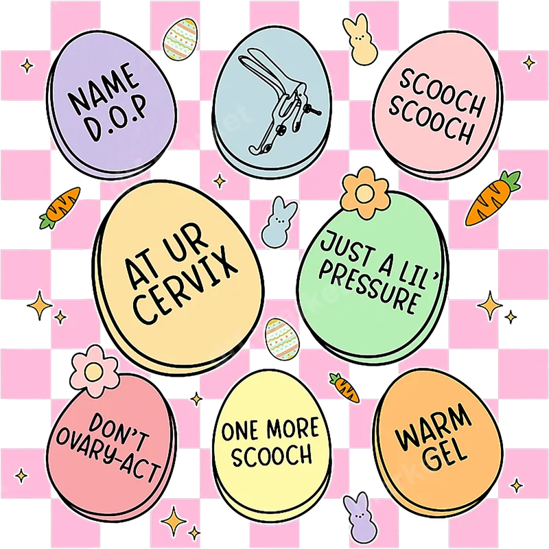 See allThis unique DTF transfer design brings adult humor to the Easter season, blending pastel candy-style eggs with hilariously relatable phrases about gynecological exams. Featuring text like "SCOOCH SCOOCH," "AT UR CERVIX," and "DON'T OVARY-ACT," plus a subtle speculum graphic, this ready to press design sparks laughter. The pink and black checkerboard background, accented with Peeps bunnies and carrots, adds an ironic touch to this sarcastic heat press design. This "Funny OBGYN Exam Easter Eggs" iron on transfer is perfect for healthcare professionals like OB/GYN nurses, doctors, and medical assistants. It’s also an ideal funny gift for friends or anyone with a great sense of humor who has experienced a pap smear or routine women's health check-up. Wear it to casual gatherings, as a conversation starter, or to add a cheeky twist to your everyday apparel. Applying this high-quality direct to film transfer is straightforward and hassle-free; no weeding or layering required. It adheres beautifully to all fabric types—cotton, polyester, and blends—making it a versatile apparel transfer for your projects. For best results, use a heat press at 300-325°F for 15 seconds with medium pressure, then cool before peeling for a perfect finish. Our DTF transfers use premium professional DTF film, ensuring vibrant colors and crisp details that won't fade. These durable heat transfers are crack-resistant and exceptionally soft, integrating seamlessly with your garment for comfort and longevity. The strong adhesive backing provides a professional, retail-quality finish every time. Transform your blank garments into unique statement pieces with ease.
