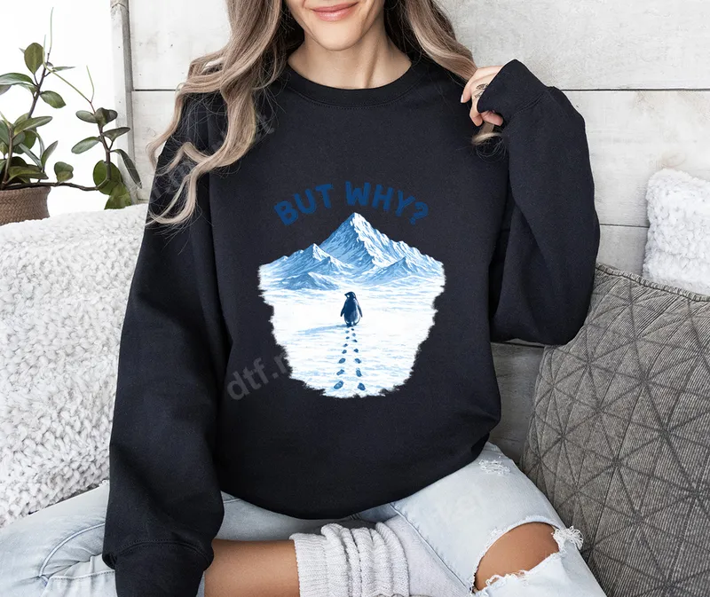 See allDive into the icy charm with our 'But Why?' penguin DTF transfer. This endearing design features a lone penguin trudging through the snow, leaving a trail of footprints towards majestic, frosty mountains, all topped with the relatable question 'BUT WHY?' in a cool blue hue. It's a whimsical and slightly existential piece, perfect for anyone who appreciates humor with a touch of nature. This high-quality direct to film transfer is ready to press onto your favorite apparel, bringing a unique character to any garment. This playful heat transfer is ideal for animal lovers, meme enthusiasts, or anyone with a dry sense of humor. Perfect for casual wear, gifting to friends who love penguins, or as a fun conversation starter. Create custom t-shirts, unique hoodies, or personalized bags. It’s a fantastic gift idea for birthdays, holidays, or just because, sure to bring a smile. Our versatile iron on transfer works flawlessly on a wide range of fabrics, including cotton, polyester, and blends. Application is a breeze with either a professional heat press (300-325°F for 15 seconds, medium pressure) or even a standard household iron. Forget the tedious weeding of vinyl transfers; this ready to press design simplifies your customization for quick and clean application. Experience superior results with our premium DTF transfers. Each design boasts vibrant, true-to-color inks that resist cracking, peeling, and fading, ensuring your custom creation looks fantastic wash after wash. The finish is remarkably soft to the touch, offering a comfortable feel that integrates seamlessly with your fabric. Crafted using professional-grade DTF film and strong adhesive, you're guaranteed a durable and high-quality apparel transfer.