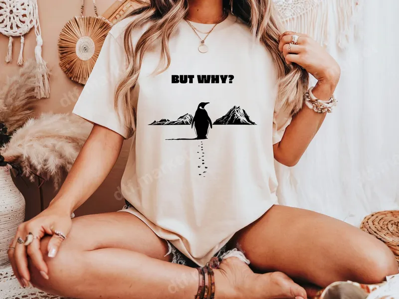 See allEmbrace your inner questioner with this hilarious "But Why?" DTF transfer. This unique design features a lone penguin looking back at its footprints with majestic mountains in the distance, all topped with the perfectly relatable query, "BUT WHY?". It's a fantastic ready to press transfer for anyone who loves a good laugh or simply contemplates the journey of life with a touch of sarcasm. This amusing penguin design is perfect for anyone with a dry wit, animal lovers, or those who appreciate a clever visual pun. It makes an excellent gift for friends, family, or even coworkers who might need a gentle reminder to question the status quo. Ideal for casual wear, social gatherings, or simply to add a dose of humor to your everyday wardrobe. Our premium direct to film transfer is incredibly easy to apply to almost any fabric, including cotton, polyester, and blends. Simply use a heat press at 300-325°F for 15 seconds with medium pressure, or apply it with a household iron following our detailed instructions. Best of all, there's absolutely no weeding required, making your crafting process quick and enjoyable. Experience professional-grade results with our high-quality DTF transfer. The design boasts vibrant, crisp black lines that are crack-resistant and incredibly soft to the touch once applied. Enjoy a durable and long-lasting apparel transfer that will keep its humor and integrity wash after wash, transforming any garment into a conversation starter.
