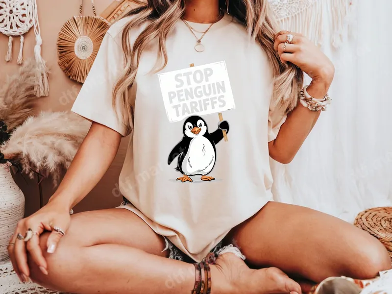 See allInject whimsical humor into your wardrobe with our 'Stop Penguin Tariffs' DTF transfer. This unique direct to film transfer features a determined cartoon penguin holding a protest sign, boldly proclaiming "STOP PENGUIN TARIFFS." It's a fun, quirky design perfect for those who appreciate a good laugh and want to make a lighthearted statement. This ready to press design is vibrant, eye-catching, and sure to spark conversations wherever you go. This hilarious heat press design is ideal for anyone with a playful spirit, a love for animals, or a penchant for internet memes. It makes a fantastic gift for friends or family, adding a touch of personality to everyday apparel. Perfect for casual outings, social gatherings, or simply lounging at home, this design offers a unique way to express your humor and stand out from the crowd. Applying your new iron on transfer is incredibly simple. Our premium DTF transfers work seamlessly on cotton, polyester, and various blends. For best results, use a heat press at 300-325°F for 15 seconds with medium pressure. Even a household iron can achieve great results with firm, even pressure. The best part? No tedious weeding required, making customization quick and effortless. Experience superior quality with every ready to press transfer from dtf.market. Our designs are crafted using professional DTF film, ensuring incredible vibrancy, exceptional crack resistance, and a super soft feel. This durable t-shirt transfer is designed to withstand countless washes, maintaining vivid colors and crisp details for long-lasting wear. Transform your apparel with a professional-grade finish.