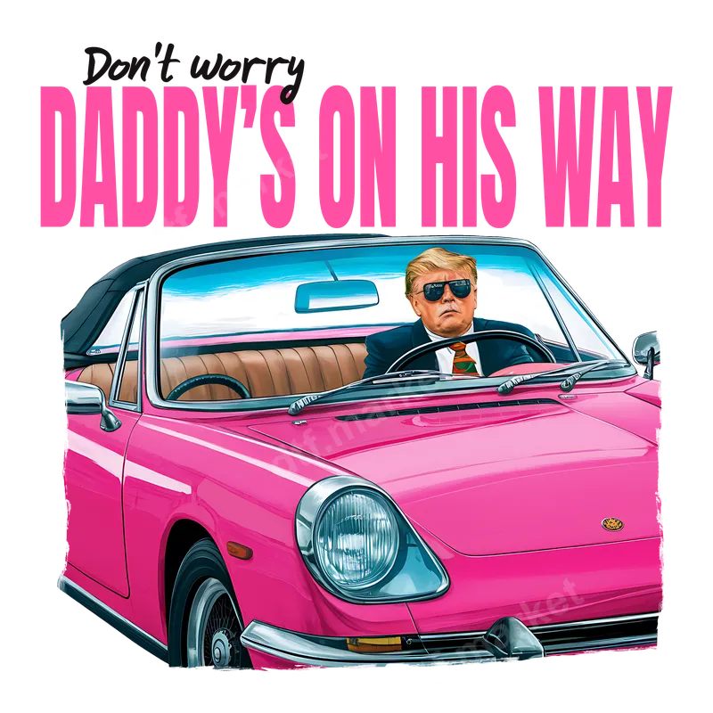 See allThis vibrant and humorous DTF transfer features a stylized illustration of Donald Trump in a sleek, bright pink convertible, complete with the catchy phrase "Don't worry DADDY'S ON HIS WAY." This design captures a playful yet bold political statement, perfect for those who appreciate satirical or pro-Trump humor. It's a high-quality, ready to press transfer that brings a unique blend of pop culture and political commentary to any garment. This direct to film transfer is ideal for supporters looking to express their views with a touch of wit and style. It's a fantastic gift idea for political rallies, campaign events, Fourth of July celebrations, or just everyday wear for those who want to make a statement. Perfect for conservatives, meme enthusiasts, or anyone with a keen sense of humor regarding current events and political figures. Applying this apparel transfer is simple and efficient. It works seamlessly on a wide range of materials, including 100% cotton, polyester, and various cotton/poly blends. For best results, use a heat press at 280-300°F for 6-10 seconds with medium pressure, then perform an instant hot peel. While a heat press is recommended for professional results, you can also achieve great outcomes with a standard household iron, following included instructions. No complicated weeding or layering required, making it a quick and easy iron on application. Our premium DTF transfers boast exceptional color vibrancy, ensuring your design truly pops. Engineered for durability, they are crack-resistant and offer a soft, flexible feel on the fabric, unlike traditional vinyl transfer options. Each heat press design is printed on professional-grade DTF film with strong adhesive, guaranteeing a long-lasting, high-quality finish that withstands countless washes.