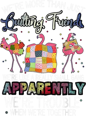 See allCelebrate your crafting crew with this delightful and humorous Quilting Friends Flamingo DTF transfer. This vibrant design features three playful pink flamingos, each adorned with charming patchwork patterns and quilting essentials like a pincushion, a colorful quilt, and a sewing machine. Surrounded by confetti, the witty text declares, 'WE'RE MORE THAN JUST Quilting Friends WE'RE LIKE A REALLY SMALL GANG APPARENTLY WE'RE TROUBLE WHEN WE'RE TOGETHER,' making this a truly unique and ready to press design for any crafty gathering. This charming apparel transfer is perfect for quilting enthusiasts, sewing club members, and anyone who enjoys crafting with friends. It makes an excellent gift for a quilting friend's birthday, a fun addition to group shirts for a craft retreat, or a celebratory design for a friendship anniversary. Small business owners creating custom apparel for craft fairs or online shops will also find this iron on transfer a popular choice. Express your bond with this unique heat transfer design, celebrating the joy and mischief of crafting together. Applying this heat press transfer is simple and rewarding, working beautifully on cotton, polyester, cotton-poly blends, and even nylon. For best results, use a heat press at 300-325°F for 15 seconds with medium pressure, or apply with a household iron. There's no tedious weeding required – just peel the film and press! Use this versatile design to create custom t-shirts, cozy hoodies, personalized tote bags, fun aprons, or unique pillow covers, adding humor and personality to any item. Our ready to press transfer ensures vibrant, full-color printing with exceptional detail, bringing the intricate patchwork and cheerful flamingos to life. Enjoy a crack-resistant finish that feels soft to the touch, unlike heavy vinyl transfers. Each direct to film transfer is meticulously printed on premium DTF film, boasting a strong adhesive backing for consistent, professional results every time. Create lasting garments that showcase your passion for quilting and your special friendships.