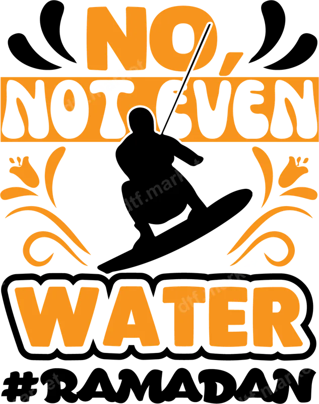 See allThis humorous DTF transfer features the relatable phrase 'No, Not Even Water' in a bold, retro-inspired orange font, accompanied by a black silhouette of a wakeboarder and decorative swirls. Below, the hashtag '#RAMADAN' clearly marks the context of this popular fasting joke. This eye-catching design is a ready to press transfer, perfect for adding a touch of lighthearted humor to your apparel during the holy month. Ideal for Muslims observing Ramadan, or anyone who appreciates cultural humor, this heat press design makes a fantastic conversation starter. It's a great gift idea for friends and family enduring the fasting period, or for yourself to wear to Iftar gatherings, family celebrations, or just everyday wear to show your dedication with a smile. Embrace the spirit of Ramadan with this fun iron on transfer. Applying this apparel transfer is simple and efficient. Use a heat press at 300-325°F for 15 seconds with medium pressure, then perform a cool peel. For those without a professional heat press, a household iron can also be used with careful application. Our high-quality DTF transfers work beautifully on a wide range of materials, including cotton, polyester, and various blends, making them incredibly versatile. Plus, there's no tedious weeding required, saving you time and effort. Crafted using professional-grade DTF film, this custom transfer ensures vibrant colors and exceptional durability. The design is engineered to be crack-resistant, stretch-friendly, and offers a soft, smooth feel once applied to your garment. Experience long-lasting quality and a professional finish that stands up to washing and wear. Get your ready to press transfer with confidence, knowing you're getting a premium product.