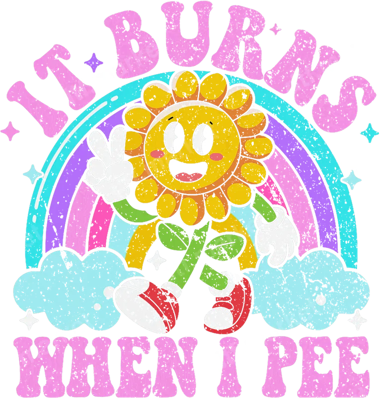 See allUnleash a dose of unexpected humor with this vibrant retro sunflower DTF transfer, featuring a cheerful cartoon sunflower character flashing a peace sign against a groovy rainbow and fluffy clouds. This eye-catching design, complete with a distressed vintage texture, boldly proclaims 'IT BURNS WHEN I PEE' in playful pink lettering. It's a perfect blend of innocent aesthetics and sarcastic wit, making it a truly unique and ready to press graphic that’s sure to turn heads and spark conversations. This hilarious heat transfer design is perfect for anyone who loves a good laugh, dark humor, or ironic fashion. Ideal for small t-shirt businesses looking for edgy inventory, crafters creating sarcastic gifts, or individuals wanting to make a bold personal statement. It's an excellent iron on transfer for casual wear, gag gifts for friends with a sense of humor, or adding a unique touch to festival outfits. Stand out at parties, social gatherings, or simply enjoy the reactions it gets during everyday errands. Applying this heat press transfer is simple and efficient. It adheres beautifully to various materials including cotton, polyester, cotton-poly blends, and even nylon. Use a heat press at 300-325°F for 15 seconds with medium pressure, or apply with a household iron for smaller projects. There's no tedious weeding required – just peel and press! Create custom t-shirts, hoodies, sweatshirts, tote bags, aprons, or even unique pillow covers. For lasting durability, wash garments inside out with cold water and tumble dry on low. Experience superior quality with this ready to press transfer. Our direct to film transfer technology ensures vibrant, full-color printing with exceptional detail that truly pops. Unlike heavy vinyl, this design offers a soft, lightweight feel, is crack-resistant, and maintains its integrity through washes. Each direct to film transfer is printed on premium DTF film with a strong adhesive backing, guaranteeing professional-grade results and long-lasting wear for all your apparel and accessory projects.