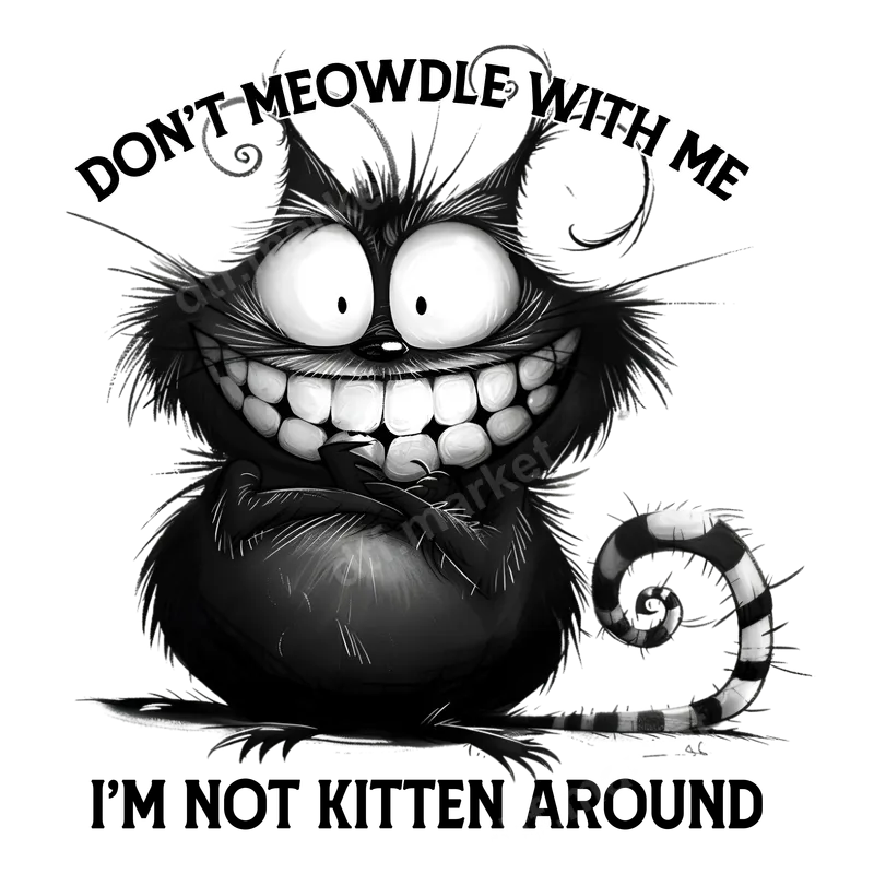 See allShow off your playful side with this incredibly funny DTF transfer featuring a mischievous black cat with a wide, toothy grin. The design is emblazoned with the clever puns, "DON'T MEOWDLE WITH ME" and "I'M NOT KITTEN AROUND," making it a purr-fect statement piece. This ready to press DTF transfer is an instant way to add a dose of humor and feline charm to any garment. This vibrant heat transfer is ideal for cat lovers, pun enthusiasts, and anyone with a sarcastic sense of humor. It makes an excellent gift for friends, family, or even yourself on birthdays, casual gatherings, or just because. Express your feisty spirit and love for all things feline with this unique iron on decal that is sure to get smiles and laughs. Applying this apparel transfer is quick and effortless. Simply use a heat press at 300-325°F for 15 seconds with medium pressure. For those without a professional heat press, a household iron can also be used with careful application. There's no weeding required, making it a hassle-free heat press design that’s ready to transform your favorite clothing items. Crafted from professional-grade DTF film, this t-shirt transfer delivers exceptional quality. Expect vibrant colors, a soft hand feel, and crack-resistant durability that holds up wash after wash. Our heat press ready transfers ensure a long-lasting, high-quality finish on cotton, polyester, and most fabric blends.