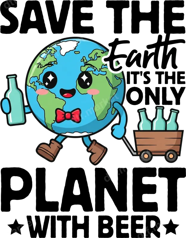 See allThe design features an adorable, wide-eyed Earth character, complete with a dapper bow tie and boots, holding a beer bottle and pulling a cart full of more beers. The witty slogan, "SAVE THE Earth IT'S THE ONLY PLANET WITH BEER," makes this a uniquely humorous DTF transfer. It’s a perfect blend of environmental appreciation and playful indulgence, making for a truly memorable ready to press design. This funny heat transfer is ideal for beer lovers, eco-conscious individuals with a sense of humor, or anyone who enjoys a good laugh. It's a fantastic gift idea for birthdays, Father's Day, Earth Day, or casual gatherings. Create custom t-shirts for bar crawls, camping trips, or just lounging around with friends, showcasing your dual passion for our planet and its most popular beverage. Applying this apparel transfer is a breeze. Our high-quality direct to film transfers work seamlessly on a wide range of materials including cotton, polyester, and various blends. For best results, use a heat press at 300-325°F for 15 seconds with medium pressure. Alternatively, a household iron can be used for smaller projects. Enjoy the convenience of a ready-to-apply design with no weeding required, making your DIY projects simple and fun. You'll love the vibrant colors and exceptional durability of this heat press design. Each iron on decal is crafted from professional-grade DTF film, ensuring a soft touch, crack-resistant finish, and superior adhesion to your garments. Our print process guarantees sharp details and lasting quality, so your unique statement piece will look great wash after wash. Trust dtf.market for premium t-shirt transfers that stand out.