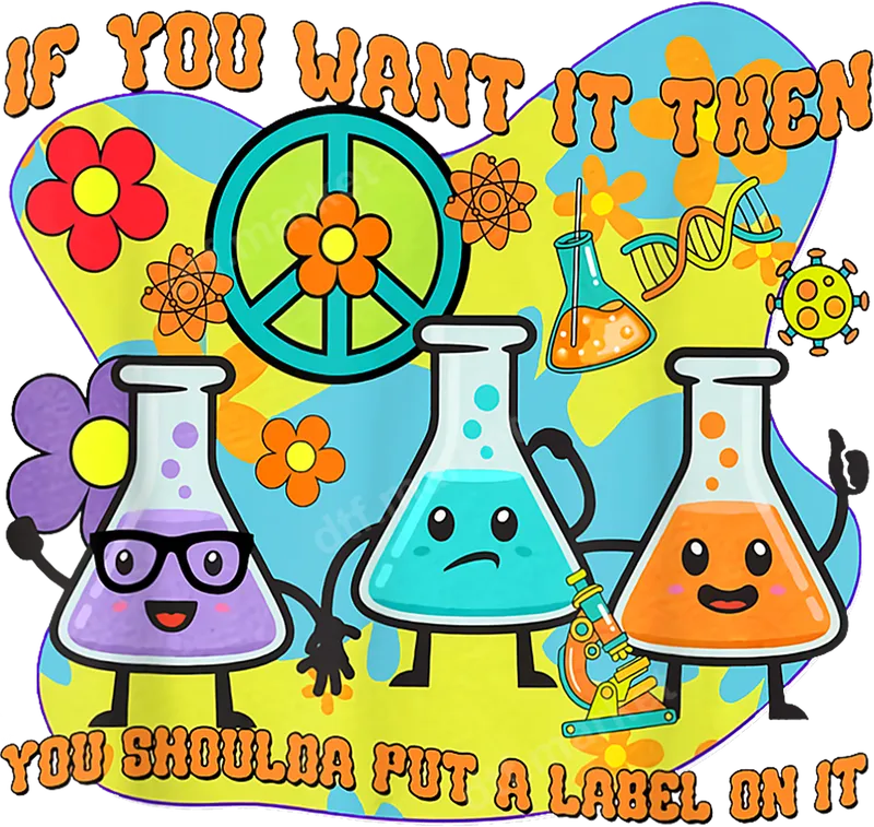 See allInject some playful science humor into your wardrobe with this unique DTF transfer. Featuring a vibrant, retro-inspired design, it showcases three charming cartoon lab flasks, each with distinct expressions, alongside the witty parody text: "IF YOU WANT IT THEN YOU SHOULDA PUT A LABEL ON IT." Surrounded by peace signs, atomic symbols, and flowers, this ready to press design perfectly blends pop culture with a scientific flair, making for a truly eye-catching apparel transfer. This heat press design is ideal for anyone with a love for chemistry, biology, or just a good laugh. It's perfect for science teachers, students, lab technicians, or anyone who appreciates smart, funny apparel. Great for back-to-school gifts, science club events, casual wear, or as a fun iron on transfer for a friend's birthday. Surprise the scientist in your life with a custom t-shirt or tote bag that showcases their passion and personality. Applying this direct to film transfer is straightforward and hassle-free. Our high-quality transfers work beautifully on a wide range of fabrics including cotton, polyester, and their blends, making it versatile for various garments. For best results, simply use a heat press at 300-325°F for 15 seconds with medium pressure, then cold peel. Alternatively, a household iron can be used for smaller projects. Enjoy the ease of no weeding, cracking, or peeling, giving you a professional-looking result every time. Experience superior quality with this professional DTF transfer. Printed using premium inks on durable DTF film, this design offers exceptional vibrancy and detail that stands out. Our transfers are crack-resistant, wash-durable, and boast a soft, flexible feel on your fabric, ensuring maximum comfort and longevity. Create custom apparel that looks fantastic and feels great, all with the convenience of a ready to press transfer from dtf.market.