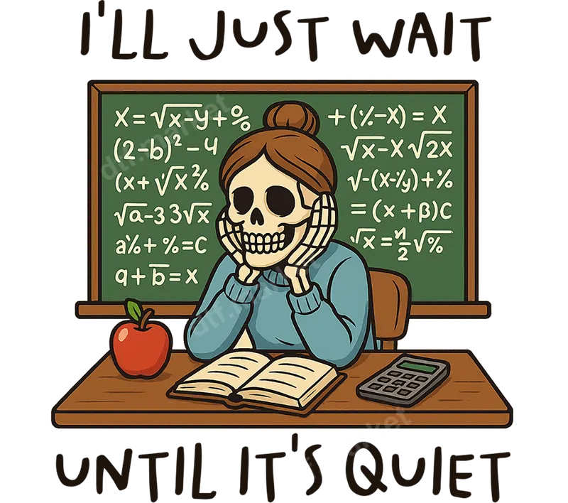 See allThis hilarious DTF transfer features a patient skeleton teacher, hands propped under her chin, waiting calmly at her desk in front of a math-filled chalkboard. The witty phrase "I'LL JUST WAIT UNTIL IT'S QUIET" perfectly captures the relatable struggle of educators in a noisy classroom. This ready to press design brings a blend of dark humor and teaching reality, making it a standout apparel transfer. Ideal for teachers, principals, school counselors, and anyone working in an educational setting, this design is a fantastic way to express your classroom humor. It makes an excellent back-to-school gift, appreciation present for Teacher Appreciation Week, or a fun addition to your everyday wardrobe. Perfect for casual Fridays, staff meetings, or just making a statement about the joys (and challenges) of teaching, this heat transfer is sure to get a laugh. Applying this heat press transfer is incredibly easy, whether you're using a professional heat press or a household iron. Our high-quality direct to film transfer adheres seamlessly to cotton, polyester, and cotton-polyester blend fabrics. Simply press at 300-325°F for 15 seconds with medium pressure. Unlike traditional vinyl transfers, there's no weeding required, saving you time and effort for a perfect application every time. You'll love the professional quality of our DTF transfers. Each image boasts vibrant colors, exceptional detail, and a soft-to-the-touch finish that feels great on any garment. Engineered to be crack-resistant and highly durable, these transfers withstand countless washes without fading or peeling. Elevate your apparel with a premium, long-lasting iron on decal that looks fantastic for years to come.