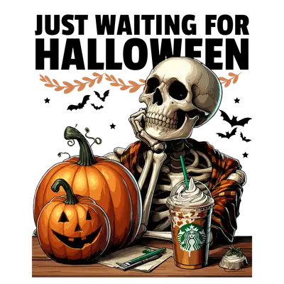 Funny Skeleton Waiting for Halloween DTF Transfer with Pumpkin & Coffee