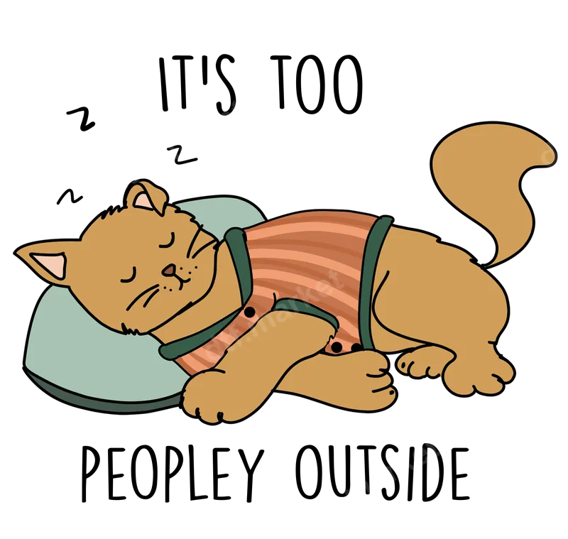 See allThis charming DTF transfer features a cartoon cat sound asleep on a blue pillow, wearing striped pajamas. The text "IT'S TOO PEOPLEY OUTSIDE" playfully captures an introverted mood or lazy day feeling. 'ZzZz' icons enhance the sleepy vibe, making this ready to press design perfect for anyone who cherishes quiet moments at home and appreciates cat humor. This design is ideal for cat owners, introverts, and homebodies who appreciate social energy jokes. It makes an excellent heat press transfer for personalized gifts: birthdays, holidays, or thoughtful presents for friends. Imagine this graphic on casual apparel or as a fun conversation starter. It's also perfect for cat enthusiasts looking for a whimsical iron on. Applying this transfer is simple for both beginners and experienced crafters. This versatile heat press design works beautifully on materials including 100% cotton, polyester, cotton/poly blends, and tri-blends. For best results, use a heat press at 300-325°F for 15 seconds with medium pressure. It's a true no-weed design – simply press and peel! A household iron can also be used. Our premium DTF transfers use professional-grade DTF film and inks, ensuring exceptional vibrancy and durability. Colors are rich and bold, resisting cracking, fading, and peeling, even after multiple washes. The final result is a soft-to-touch t-shirt transfer that feels integrated into the fabric, not stiffly on top. Enjoy a professional finish, making your custom apparel stand out with this durable iron on decal.