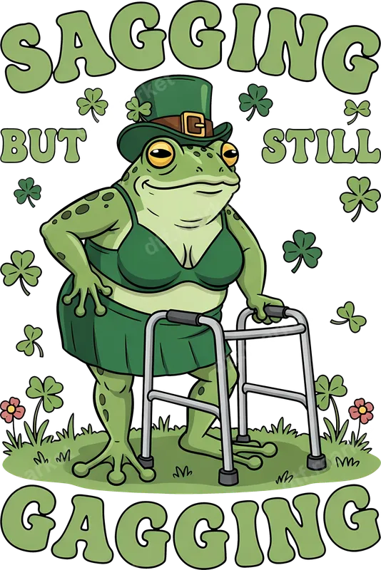 See allUnleash some cheeky charm this St. Patrick's Day with our 'Sagging But Still Gagging' DTF transfer. This hilarious design features a confident frog rocking a green bikini, a leprechaun hat, and a walker, all surrounded by festive shamrocks. It's a bold, ready to press image that perfectly captures a playful, adult humor vibe, ensuring your apparel stands out with a witty statement. This unique heat transfer is ideal for anyone who loves a good laugh and isn't afraid to show their fun, slightly irreverent side during St. Patrick's Day celebrations. It makes a fantastic gift for friends with a sassy attitude, for gag gifts, or for creating custom apparel for pub crawls, parades, or festive gatherings. Embrace the spirit of the holiday with a design that's sure to be a conversation starter and bring smiles. Our premium iron on transfer is engineered for effortless application, making customization a breeze. It adheres beautifully to a wide array of fabrics, including cotton, polyester, and various blends. For best results, use a heat press at 300-325°F for 15 seconds with medium pressure, followed by a cool peel. A household iron can also be used with care, making this heat press design incredibly versatile. Forget tedious weeding; these vibrant transfers are completely ready to press! Experience superior quality with every DTF transfer. Our direct to film transfers boast incredibly vibrant colors that pop, along with excellent durability, resisting cracks and fading even after multiple washes. The finish is remarkably soft to the touch, seamlessly integrating with your garment without feeling stiff. Crafted on professional-grade DTF film with a strong, reliable adhesive, you can trust that your custom transfer will last and look fantastic for years to come.