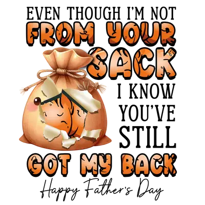 See allThis hilarious DTF transfer features a playful design perfect for Father's Day, depicting a cartoon sack with a little butt peeking out, accompanied by the witty phrase: 'EVEN THOUGH I'M NOT FROM YOUR SACK I KNOW YOU'VE STILL GOT MY BACK Happy Father's Day'. The bold, orange-patterned typography complements the charming illustration, making this a truly unique and ready to press design. It captures the loving, lighthearted bond between a child and their non-biological father figure with humor and affection. This heartwarming and funny heat transfer design is ideal for anyone looking to celebrate stepdads, adoptive fathers, or any incredible father figure who stepped up. It's the perfect iron on transfer for Father's Day gifts, birthdays, or just to show appreciation. Small t-shirt businesses, Etsy sellers, and crafters can easily create popular apparel, while individuals can make memorable custom shirts for family gatherings or special occasions. This design resonates with blended families and anyone with a great sense of humor. Applying this vibrant heat press transfer is incredibly simple and efficient. It works seamlessly on a wide range of materials, including cotton, polyester, cotton-poly blends, and even nylon, offering versatility for your projects. Achieve professional results with a heat press (300-325°F for 15 seconds, medium pressure) or even a household iron. There's no tedious weeding required – just peel and press! Use this design to create unique custom t-shirts, cozy hoodies, stylish tote bags, fun aprons, or durable denim jackets. For long-lasting wear, wash garments inside out and tumble dry on low heat. Our premium ready to press transfer boasts vibrant, full-color printing with exceptional fine detail, ensuring your design truly stands out. You'll love the crack-resistant finish and soft-to-the-touch feel, without the heavy, stiff texture often associated with traditional vinyl. Each direct to film transfer is meticulously printed on high-quality DTF film, engineered with a strong adhesive backing for superior adherence and professional, long-lasting results every single time you press.