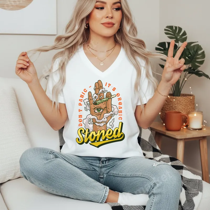 See allThis vibrant DTF transfer features a unique and humorous design: an open hand with an all-seeing eye in the palm, delicately holding a lit cannabis joint, surrounded by wisps of smoke. Bold text proudly declares "Don't Panic - It's Organic" and a prominent "Stoned" underneath, capturing a relaxed, counter-culture vibe. This eye-catching direct to film transfer is ready to press, bringing an instant, laid-back statement to any garment or accessory. Perfect for cannabis enthusiasts, festival-goers, and anyone who appreciates a good laugh and a chill attitude, this heat press design makes an excellent addition to casual wear. It's an ideal conversation starter for parties, concerts, 420 celebrations, or just everyday comfort. Consider it a unique gift for friends who enjoy cannabis culture, or for anyone wanting to express their humorous and relaxed personality through their apparel. Applying this ready to press transfer is incredibly simple and requires no tedious weeding like traditional vinyl transfers. Our high-quality iron on transfer works flawlessly on a wide range of fabrics, including cotton, polyester, and various blends. For best results, use a heat press at 300-325°F for 15 seconds with medium pressure, then cool peel. A household iron can also be used with careful application. Crafted with professional-grade DTF film, this apparel transfer boasts incredibly vibrant colors that pop and remain true wash after wash. The design is engineered to be crack-resistant, ensuring durability and longevity on your chosen garment. With a soft-to-touch finish and strong adhesive, this t-shirt transfer integrates seamlessly into the fabric, providing a high-quality, professional look and feel that will last.