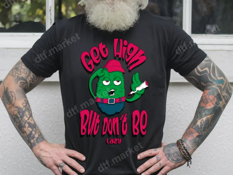 See allThis vibrant direct to film transfer features a comical cartoon cannabis bud character, complete with red eyes, a red cap, and a lit joint, alongside the cheeky phrase "Get High But Don't Be Lazy." This ready to press design brings a playful and rebellious vibe, perfect for those who appreciate stoner humor and a relaxed attitude. It's an ideal choice for adding a unique touch to your wardrobe or crafting projects with a standout DTF transfer. This heat transfer is designed for cannabis culture enthusiasts, those with a good sense of humor, and anyone looking to express their laid-back personality. It makes a fantastic gift for friends, significant others, or even yourself, for birthdays, casual get-togethers, 4/20 celebrations, or just everyday wear. Great for personalizing items for festivals, concerts, or simply lounging. Applying this iron on transfer is a breeze, whether you're using a professional heat press or a household iron. Our high-quality heat press design adheres beautifully to a wide range of fabrics, including cotton, polyester, and their blends. For best results, press at 300-325°F for 15 seconds with medium pressure. Unlike vinyl transfer, there's no tedious weeding required – just press and peel! Experience superior quality with this apparel transfer. Our DTF film ensures ultra-vibrant colors and crisp details that truly pop. The design is engineered to be crack-resistant, ensuring durability and longevity wash after wash. It feels incredibly soft to the touch, seamlessly blending with the fabric, and boasts a strong adhesive for a professional finish every time.
