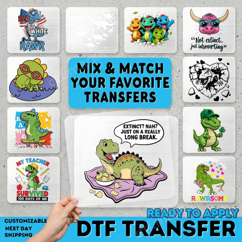 See allThis unique DTF transfer showcases a hilariously lazy T-Rex dinosaur, lounging on a purple blanket and enjoying potato chips. A speech bubble humorously declares, "EXTINCT? NAH? JUST ON A REALLY LONG BREAK." This ready to press design captures a relatable, laid-back vibe, perfect for anyone who appreciates a good chuckle and a relaxed approach to life. It's a whimsical and funny take on a prehistoric favorite. This hilarious dinosaur heat transfer is ideal for many individuals. It's perfect for dinosaur enthusiasts, humor lovers, and those with sarcastic wit. Great for casual wear, weekend outings, or as a conversation starter. It makes an excellent gift for birthdays, Father's Day, or for anyone who enjoys a chill, funny vibe. Applying this direct to film transfer is straightforward. Our high-quality heat press transfers work seamlessly on almost any fabric, including 100% cotton, polyester, and blends. For best results, use a heat press at 300-325°F for 15 seconds with medium pressure, cold peel. A household iron can also work. No weeding required, saving time and effort over vinyl transfer alternatives. Our ready to press transfers are crafted using premium DTF film and state-of-the-art printing, ensuring a professional finish. You'll love the vibrant colors, exceptional durability, and crack-resistant qualities. The strong adhesive ensures a long-lasting bond with your garment, and the transfer is incredibly soft to the touch. Create custom t-shirts, hoodies, or bags that stand out with this top-tier apparel transfer.
