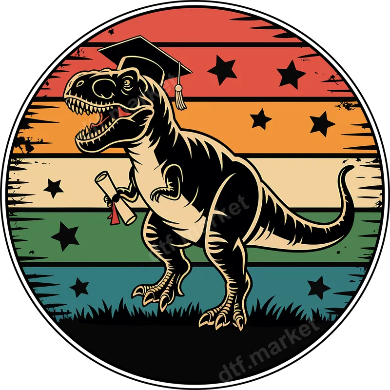 See allCelebrate academic achievement with a roar! This vibrant DTF transfer features a cool, retro-style T-Rex dinosaur proudly sporting a graduation cap and holding a rolled diploma. Set against a distressed, multi-colored striped background adorned with stars, this ready to press design brings a playful yet celebratory vibe. It's a high-quality direct to film transfer, ensuring crisp details and rich colors for any garment project. This unique heat press transfer is perfect for graduating students of all ages – from preschool and elementary school to high school and college. It makes an excellent gift for parents to celebrate their child's milestone, or for anyone who loves dinosaurs with a sense of humor. Ideal for graduation parties, ceremonies, or as a thoughtful present to commemorate a special achievement, this funny dinosaur design is sure to stand out. Applying this apparel transfer is a breeze, whether you're a seasoned crafter or a beginner. Our premium DTF transfers work seamlessly on a wide range of materials, including cotton, polyester, and various blends. For best results, use a heat press at 300-325°F for 15 seconds with medium pressure, then cold peel. No weeding or intricate layering is required, making this an incredibly convenient iron on transfer for all your customization needs. Crafted using professional-grade DTF film and inks, this t-shirt transfer delivers exceptional durability and a soft, flexible feel. The design is crack-resistant, fade-resistant, and ensures your customized garments will look fantastic wash after wash. Elevate your apparel game with this long-lasting, professional-quality heat press ready design.