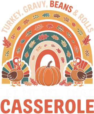 See allEmbrace the delicious chaos of Thanksgiving with this hilarious and vibrant DTF transfer! Featuring a festive fall-colored rainbow adorned with autumn leaves, two cheerful cartoon turkeys, and a plump pumpkin, this design playfully lists classic holiday dishes: 'TURKEY, GRAVY, BEANS & ROLLS'. Below, the bold statement 'LET ME SEE THAT CASSEROLE' adds a touch of relatable humor for every food-lover. This ready to press design captures the joyful spirit of autumn and the anticipation of a delicious holiday meal. This unique iron on transfer is perfect for home cooks, Thanksgiving hosts, family members gathering for the feast, or anyone who just really, really loves holiday casseroles. It’s an ideal gift for foodies, autumn enthusiasts, or small businesses looking to create festive apparel. Design custom shirts for your family's Thanksgiving gathering, a fall festival, or simply to express your love for all things autumnal. This heat transfer design makes a fantastic conversation starter at any holiday event. Applying this heat press transfer is simple and efficient. It works beautifully on a wide range of materials including cotton, polyester, cotton-poly blends, and even nylon. Achieve professional results with a heat press (300-325°F for 15 seconds, medium pressure) or use a household iron. No tedious weeding is required – just peel and press! Create custom t-shirts, cozy hoodies, comfy sweatshirts, practical tote bags, charming pillow covers, or even unique aprons. For lasting durability, wash garments inside out and tumble dry low. Our ready to press transfer ensures vibrant, full-color printing with exceptional fine detail. Experience a crack-resistant design that is soft to the touch, without the heavy, stiff feel often associated with vinyl. Each direct to film transfer is meticulously printed on premium DTF film, featuring a strong adhesive backing to guarantee professional-quality results on every garment you customize.