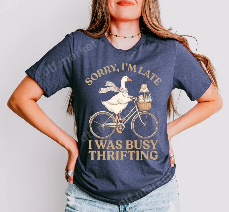 See allEmbrace your love for second-hand treasures with this charming and witty DTF transfer! This delightful design features an anthropomorphic goose, jauntily pedaling a vintage bicycle, complete with a basket overflowing with quirky thrift store finds like a teacup and a quaint lamp. Above this humorous scene, the phrase "SORRY, I'M LATE I WAS BUSY THRIFTING" captures the essence of a true thrifting enthusiast. This ready to press design is perfect for adding personality to any garment. This unique design is a must-have for thrifting enthusiasts, vintage lovers, and anyone with a good sense of humor. It makes an excellent gift for friends who spend their weekends hunting for bargains, or for yourself to proudly display your passion for sustainable fashion and unique finds. Wear it to your next thrift store adventure, casual outing, or simply to bring a smile to everyone's face. Our premium direct to film transfer is incredibly versatile, suitable for application on a wide range of fabrics including cotton, polyester, and various blends. Applying this heat press transfer is straightforward: simply use a professional heat press at 300-325°F for 15 seconds with medium pressure. Unlike traditional vinyl, there's absolutely no weeding required, making your crafting process quick and enjoyable. This iron on transfer also works with a household iron for smaller projects. Experience the professional quality of our apparel transfer. Each design boasts vibrant colors that pop, ensuring your garment stands out. Made with durable DTF film and a strong adhesive, our transfers are crack-resistant, wash-durable, and incredibly soft to the touch. Easily create custom t-shirts, hoodies, and tote bags that look professionally printed and last wear after wear.