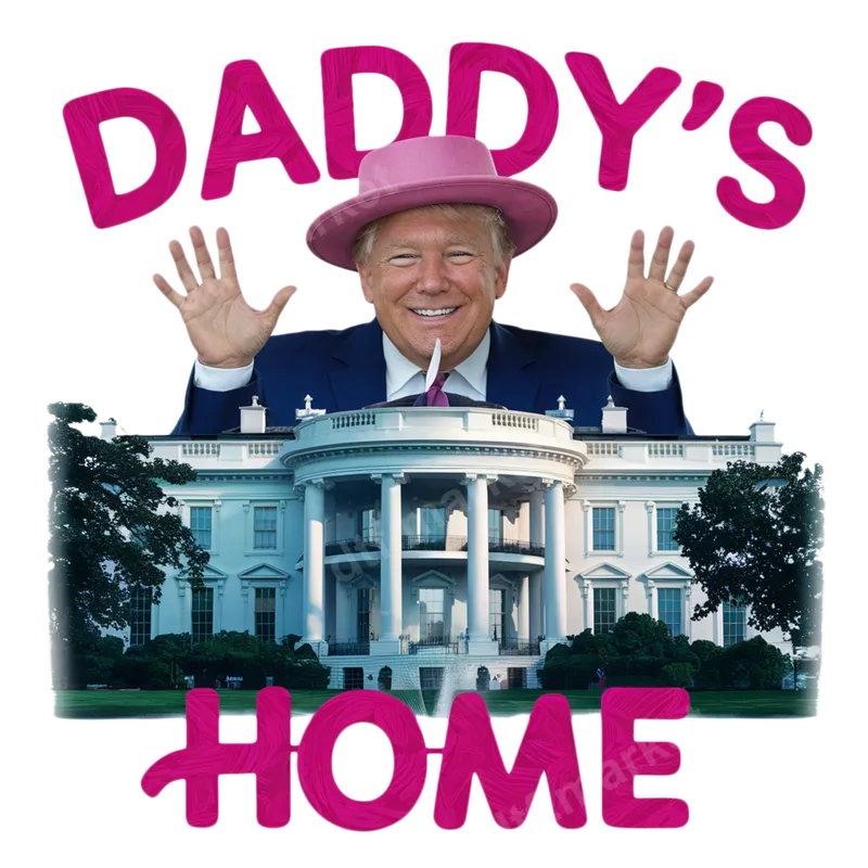 See allThis unique DTF transfer features a humorous depiction of former President Donald Trump, sporting an eye-catching pink hat, emerging joyfully from the White House, with the bold text 'DADDY'S HOME' in a vibrant, textured pink font. It's a ready to press design that captures attention and sparks conversation, perfect for making a statement on your chosen apparel. This high-quality DTF transfer ensures a smooth application and professional finish. Ideal for political enthusiasts, Trump supporters, or anyone who appreciates a witty and bold statement piece, this heat press design is perfect for rallies, election watch parties, casual outings, or as a distinctive gift for friends and family who share a similar sense of humor and political perspective. Whether you're customizing for yourself or a group, this design is sure to stand out in any crowd or gathering. Our high-quality heat transfer is designed for easy application on a wide range of materials. It works flawlessly on cotton, polyester, and various fabric blends. For best results, apply with a heat press at 280-300°F for 6-10 seconds with medium pressure, then perform an instant hot peel. No tedious weeding or layering is required, making your customization project quick and hassle-free, unlike traditional vinyl transfer applications. This iron on transfer simplifies the custom apparel process. Experience vibrant colors and exceptional durability with this professional-grade apparel transfer. Our DTF film ensures a soft hand feel, crack-resistant finish, and strong adhesive that withstands numerous washes. Your finished garment will maintain its striking look and feel, providing a lasting impression for your personalized t-shirt or hoodie, offering a truly ready to press transfer experience.