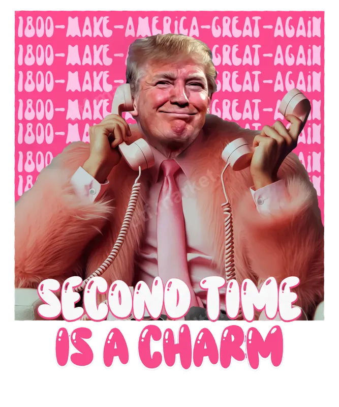 See allUnleash your sense of political humor with this unique DTF transfer featuring a vibrant, satirical depiction of Donald Trump. Dressed in an unexpected pink fur coat, holding two retro pink rotary phones, and set against a backdrop of "1800-MAKE-AMERICA-GREAT-AGAIN" in a groovy font, this design is topped off with the bold statement "SECOND TIME IS A CHARM." This premium direct to film transfer is a ready to press transfer, perfect for making an unforgettable statement. This eye-catching heat press design is ideal for political humor enthusiasts, Gen Z meme connoisseurs, and anyone who loves to incorporate pop culture commentary into their apparel. It's perfect for casual wear, political rallies, themed parties, or as a hilarious gag gift. Stand out from the crowd and spark conversations wherever you go with this one-of-a-kind design. Our apparel transfer is incredibly versatile and works seamlessly on a variety of fabrics including cotton, polyester, and most blends. Application is a breeze with a heat press (280-300°F for 6-10 seconds, medium pressure, instant peel) or even a household iron. Forget the tedious process of weeding; this iron on transfer comes ready to apply, saving you time and effort. Crafted with professional-grade DTF film and strong adhesive, this t-shirt transfer ensures brilliant, vibrant colors that resist cracking and fading. The result is a durable design with a soft hand feel that will look fantastic on your garments for years to come. Elevate your wardrobe with a touch of satirical genius!