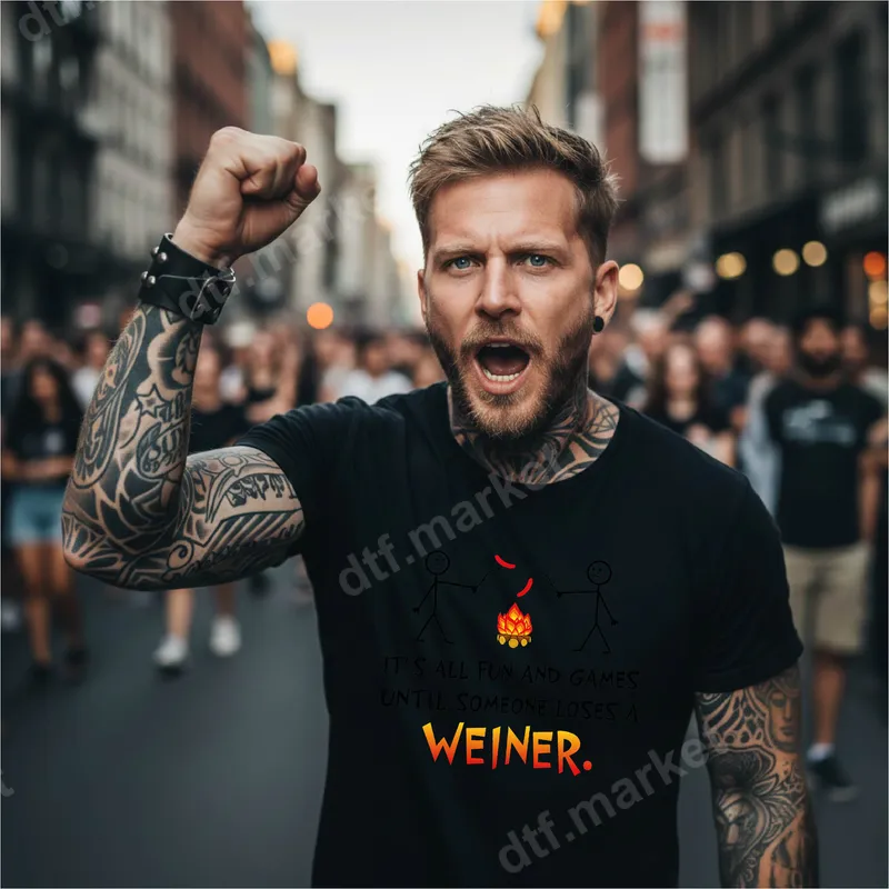 See allGet ready to ignite some laughter with this hilariously cheeky DTF transfer! Featuring two stick figures attempting to roast hot dogs over a crackling campfire, this ready to press design proudly displays the unforgettable phrase: 'IT'S ALL FUN AND GAMES UNTIL SOMEONE LOSES A WEINER.' The word 'WEINER' pops with a fiery, gradient effect, adding to the playful, adult-oriented humor. It's the perfect statement piece for anyone who enjoys a good, suggestive pun. This funny heat press transfer is ideal for anyone with a playful, mischievous side and a love for the outdoors – or just a good laugh. Perfect for camping trips, backyard BBQs, bonfire nights, or as a hilarious gift for friends, family, or partners who appreciate adult humor. It's a great conversation starter for bachelor parties, casual gatherings, or just to bring a smile to someone's face. Show off your fun personality with this unique shirt design. Our premium DTF transfers are incredibly versatile and easy to apply. Designed to work flawlessly on a wide range of materials, including cotton, polyester, and various blends, this heat press ready decal ensures maximum compatibility. For best results, use a heat press at 300-325°F for 15 seconds with medium pressure. It can also be applied with a household iron with careful technique. Enjoy a seamless application process with absolutely no weeding required, making custom apparel a breeze. Experience professional-grade results with every application. This high-quality direct to film transfer boasts vibrant colors that pop and crisp details, ensuring your design looks fantastic wash after wash. The durable print is crack-resistant and feels incredibly soft to the touch, seamlessly blending with the fabric. Crafted using professional DTF film and a strong adhesive, you can trust that your iron on transfer will last, maintaining its integrity and humor for years to come.