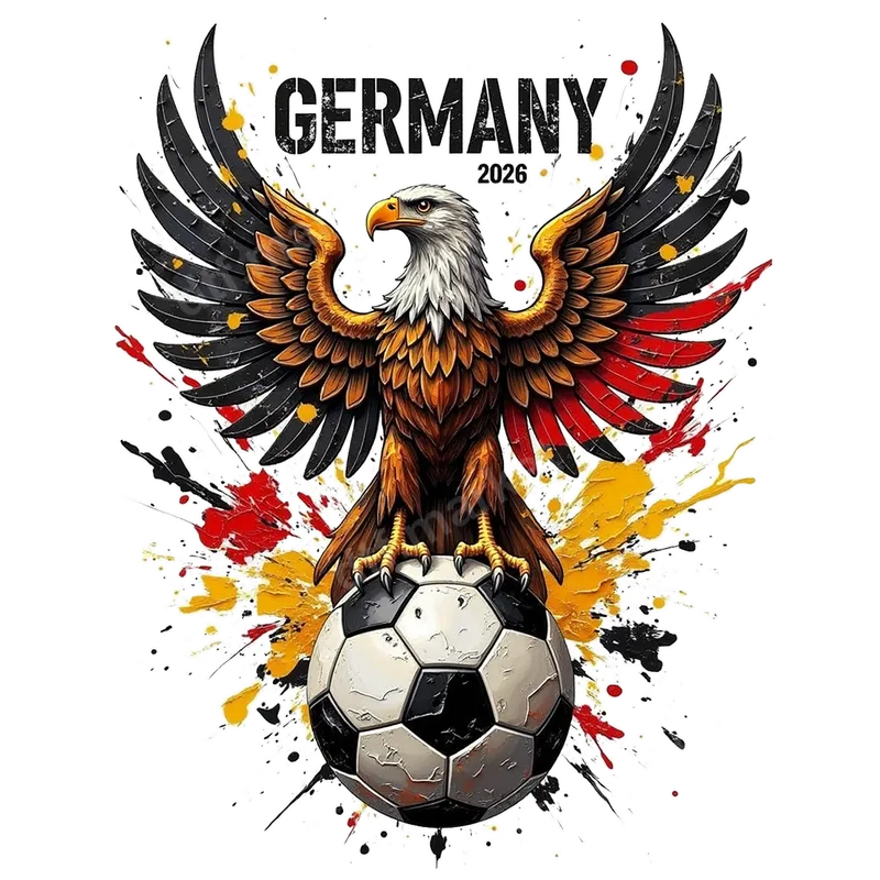 See allUnleash your passion for German football with this striking Germany 2026 eagle DTF transfer. This vibrant design features a majestic eagle, a symbol of strength and national pride, with wings spread wide, one in bold black and the other in fiery red, mirroring the iconic German flag. Perched triumphantly atop a classic soccer ball, with dynamic red, yellow, and black paint splatters adding an energetic flair, this ready to press transfer captures the spirit of the game and national pride. It's the perfect way to celebrate upcoming tournaments and show your allegiance. This heat press ready apparel transfer is a must-have for devoted German football fans, soccer enthusiasts, and anyone looking to express their patriotism in style. Ideal for cheering on your favorite team during major tournaments like the World Cup 2026 or the European Championships, game days, sports bars, or fan gatherings. It also makes a fantastic gift for sports lovers, teammates, or family members. Create custom t-shirts, hoodies, and jerseys that stand out in the crowd. Applying this high-quality DTF transfer is incredibly easy, whether you use a professional heat press or a household iron. For best results with a heat press, apply at 280-300°F for 6-10 seconds with medium pressure, then perform an instant peel. This versatile iron on decal works seamlessly on a wide range of fabrics including cotton, polyester, and various blends, ensuring vibrant results every time. Forget about tedious weeding or complex layering – simply press and go! Experience professional-grade quality with every print. Our premium DTF transfers are renowned for their vibrant colors that truly pop, exceptional crack resistance, and a soft-to-the-touch finish that feels great on any garment. Crafted using professional DTF film with a strong adhesive, these designs are engineered for durability, ensuring your German football pride lasts wear after wear and wash after wash. Get ready to showcase your team spirit with a durable and impressive design.
