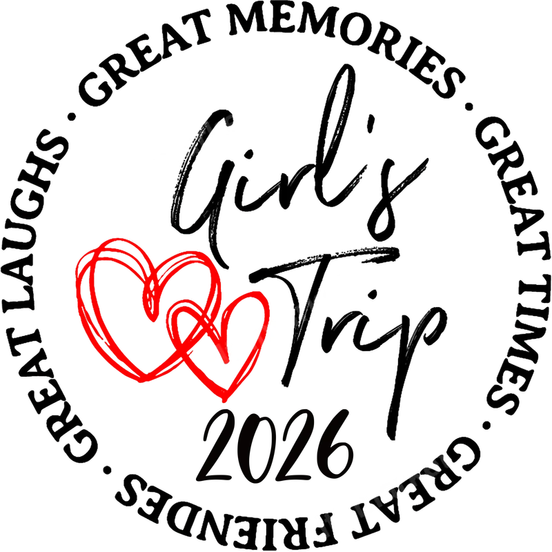 See allThis vibrant DTF transfer captures the essence of an unforgettable "Girl's Trip 2026," celebrating friendship and adventure. Featuring a stylish script font for "Girl's Trip" and the year "2026," it's beautifully accented with two interlocking red hearts, symbolizing strong bonds. Encircling the main design are joyful affirmations: "GREAT LAUGHS • GREAT MEMORIES • GREAT TIMES • GREAT FRIENDS." This ready to press design is perfect for commemorating special journeys with your closest companions, making every shared moment even more special. Designed for groups of best friends planning their ultimate getaway, this heat transfer is ideal for bachelorette parties, weekend retreats, destination birthdays, or any annual girlfriends' vacation. It makes fantastic matching apparel for your travel crew, creating unified looks for photos and memories. Surprise your squad with these unique iron on transfers as a thoughtful gift before embarking on your next big adventure together, enhancing the excitement and camaraderie of your upcoming trip. Our high-quality DTF transfers are incredibly versatile and can be applied to a wide range of fabrics, including cotton, polyester, and various blends. Applying your design is effortless, requiring just a heat press (300-325°F for 15 seconds with medium pressure) or a standard household iron. Say goodbye to tedious weeding, as this ready to press transfer ensures a smooth, professional finish with minimal effort, allowing you more time to enjoy your trip planning. Experience superior quality with our direct to film transfers, engineered for vibrant colors, exceptional durability, and a soft-to-the-touch feel. Each apparel transfer is printed on professional-grade DTF film using strong adhesive powders, ensuring a crack-resistant finish that withstands countless washes. These t-shirt transfers provide a retail-quality look, making your custom creations stand out and keeping your memories vibrant for years to come.