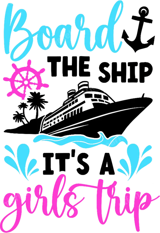 See allThis vibrant design features the playful phrase "Board THE SHIP IT'S A girls trip" in a mix of stylish script and bold fonts. Adorned with a classic cruise ship, swaying palm trees, an anchor, and a ship's wheel, all accented with cheerful pink and bright blue colors, this graphic perfectly captures the excitement of a ladies' getaway. It's a premium DTF transfer, meticulously crafted and absolutely ready to press onto your favorite apparel. This fun heat transfer is ideal for groups of friends planning a cruise vacation, a beach holiday, or any special trip together. Perfect for bachelorette parties, birthday trips, or just a memorable girls' weekend escape. Imagine matching custom t-shirts for everyone in your crew, creating unforgettable memories and fantastic photo opportunities. It also makes a fantastic gift for the travel enthusiast in your life! Applying this iron on transfer is a breeze, whether you're a seasoned crafter or a beginner. It works beautifully on a wide variety of materials, including cotton, polyester, and poly-blend fabrics. For best results, use a heat press at 300-325°F for 15 seconds with medium, even pressure. Unlike vinyl transfer methods, there's no weeding required – just press and peel for a perfect finish every time. Our DTF transfers are known for their exceptional quality, delivering incredibly vibrant colors and sharp details that truly pop. They are designed to be crack-resistant, ensuring your custom shirt design looks fantastic wash after wash. The finished garment will have a soft, lightweight feel, and the strong adhesive ensures professional, long-lasting results. Elevate your wardrobe with a durable and stylish apparel transfer.