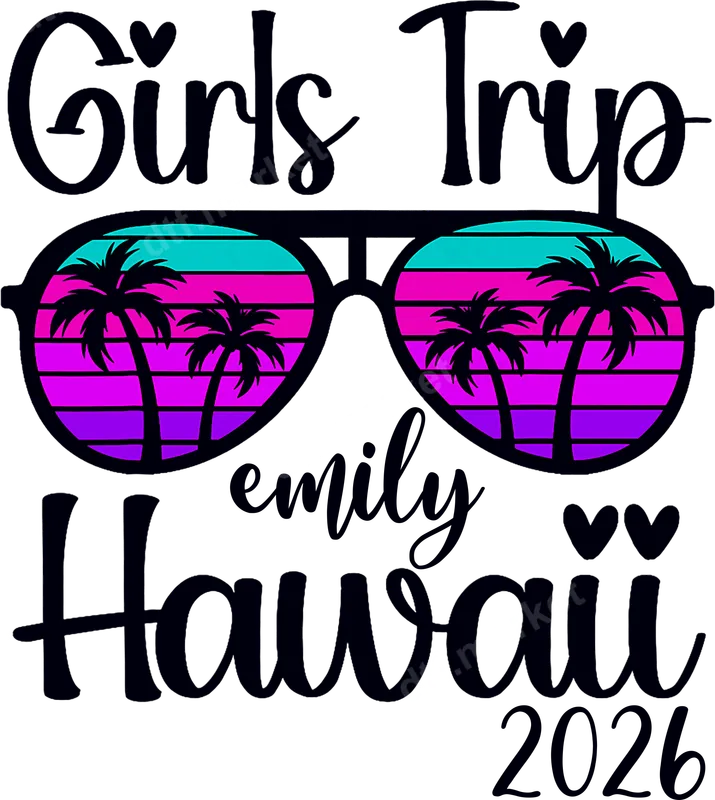 See allThis vibrant Girls Trip Hawaii 2026 DTF transfer captures the essence of a dream beach vacation with its iconic aviator sunglasses reflecting a stunning retro sunset. Featuring lush palm tree silhouettes against a backdrop of bold magenta, purple, and teal stripes, this eye-catching design is perfect for celebrating your upcoming adventure. The personalized "Girls Trip Hawaii 2026" text is rendered in a charming script font, making this a truly unique and ready to press design for your group. Ideal for bachelorette parties, milestone birthdays, or just a much-needed getaway with your closest friends or sisters, this apparel transfer makes creating matching outfits a breeze. Imagine coordinating t-shirts, hoodies, or beach bags for your entire squad, making unforgettable memories and fantastic photo ops. It's a thoughtful gift for every participant, adding a special touch to your Hawaii vacation. Our premium direct to film transfer is incredibly versatile, applying beautifully to cotton, polyester, and most fabric blends. For best results, use a heat press at 300-325°F for 15 seconds with medium pressure, then cold peel for a flawless finish. You can even use a household iron for smaller applications. Forget weeding vinyl transfer designs; these iron on transfers are pre-printed and ready for instant application. Experience superior quality with our durable heat transfers that boast vibrant colors and a soft, flexible feel on any fabric. Designed to be crack-resistant and long-lasting, your custom garments will withstand countless washes. Each heat press design is printed on professional-grade DTF film with strong adhesive, ensuring your Girls Trip Hawaii mementos look fantastic for years to come.