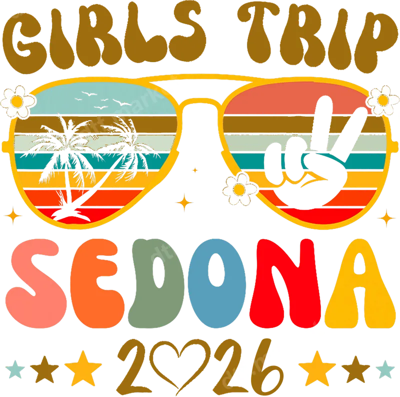 See allGet ready for an unforgettable adventure with our 'Girls Trip Sedona 2026' DTF transfer! This vibrant design captures the essence of a fun getaway with its retro sunglasses, featuring a serene beach scene with palm trees on one lens and a peaceful hand gesture on the other, all set against a beautiful striped sunset background. The bold, groovy lettering for 'Girls Trip' and 'Sedona 2026' makes this ready to press design perfect for commemorating your special journey. This unique heat transfer is ideal for best friends, sisters, or any group of women planning their ultimate Girls Trip, bachelorette party, or a special vacation to Sedona in 2026. Create matching outfits for your travel crew or design personalized gifts that will serve as cherished mementos from your unforgettable journey. It's a fantastic way to build excitement before the trip or to remember it for years to come. Our high-quality heat press transfer can be easily applied to a wide range of garments, including cotton, polyester, and various blends. For best results, use a heat press at 300-325°F for 15 seconds with medium pressure. It's also suitable for application with a household iron, making customization accessible for everyone. Enjoy the convenience of a vivid, professional finish with no weeding required, unlike traditional vinyl transfers. Experience superior quality with our Direct-to-Film transfers. Each iron on transfer boasts vibrant colors that pop, is incredibly soft to the touch, and offers excellent crack resistance. Crafted from professional DTF film with strong adhesive, this apparel transfer ensures a lasting, durable finish on your custom t-shirts, hoodies, and other accessories, looking great wash after wash.