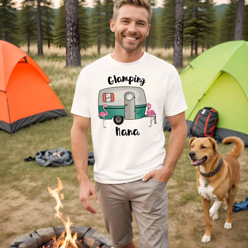 See allThis charming Glamping Nana DTF transfer captures the essence of stylish outdoor adventures. Featuring a whimsical retro camper trailer in cool grey and teal, flanked by two playful pink flamingos, it's a delightful ode to grandmas who love to camp with a touch of glamour. The elegant script fonts for "Glamping" and "Nana" complete this fun design, making it a perfect ready to press graphic for your next project. This unique apparel transfer is ideal for grandmothers, glamping enthusiasts, and anyone who appreciates a touch of vintage charm with their outdoor hobbies. It makes an excellent gift for Mother's Day, birthdays, or as a special treat for Nana before her next camping trip or family reunion. Imagine her proudly wearing this vibrant shirt design on her next adventure! Applying this professional heat press transfer is incredibly easy. Designed for versatility, it adheres beautifully to a wide range of fabrics including cotton, polyester, and various blends. For best results, use a heat press at 300-325°F for 15 seconds with medium, even pressure. This iron on transfer requires no weeding or masking, simplifying your customization process. You can even use a household iron for smaller applications, following specific instructions. Our premium DTF transfers are known for their exceptional quality, delivering vibrant colors and crisp details that truly stand out. Crafted from durable, professional-grade DTF film with a strong adhesive, these t-shirt transfers are crack-resistant and boast a soft, lightweight feel once applied. Enjoy a long-lasting, high-quality finish with every ready to press transfer, ensuring your custom garments look fantastic wash after wash.
