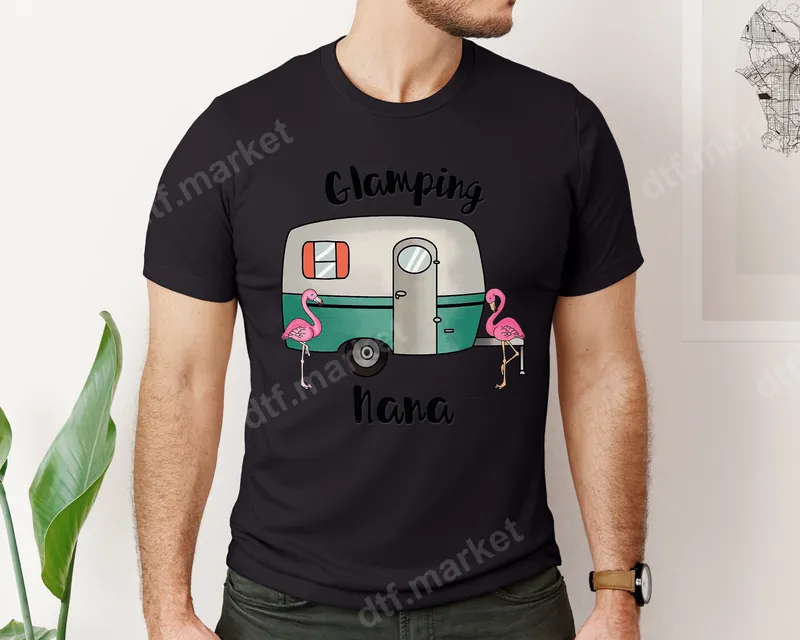See allThis charming DTF transfer features a whimsical design perfect for the adventurous grandmother. It showcases a retro-style camper trailer in serene teal and grey, flanked by two playful pink flamingos, with the delightful phrase "Glamping Nana" elegantly scripted above and below. This ready to press design encapsulates the joy of glamorous camping, offering a unique and personalized touch for any apparel or accessory. This delightful heat press design is tailor-made for grandmothers who adore the great outdoors but appreciate comfort and style—the true glamping nans! It makes an ideal gift for Mother's Day, birthdays, Christmas, or as a thoughtful present for a new grandparent. Perfect for family camping trips, RV vacations, or simply showing off a beloved Nana's fun-loving spirit around town. Applying this high-quality iron on transfer is simple, whether you're a crafting novice or a seasoned pro. Our direct to film transfers adhere beautifully to a wide range of fabrics, including cotton, polyester, and various blends. For best results, use a heat press at 300-325°F for 15 seconds with medium pressure. It can also be applied with a household iron (firm, even pressure) for convenient at-home customization. Best of all, there's no tedious weeding required—just press and enjoy! Crafted using premium professional DTF film, this t-shirt transfer ensures stunning, vibrant colors that pop and remain brilliant wash after wash. The design is soft to the touch, highly durable, and crack-resistant, ensuring your customized garment looks fantastic for years to come. With its strong adhesive backing, you can trust this apparel transfer to create a long-lasting, professional-grade finish on your chosen item.